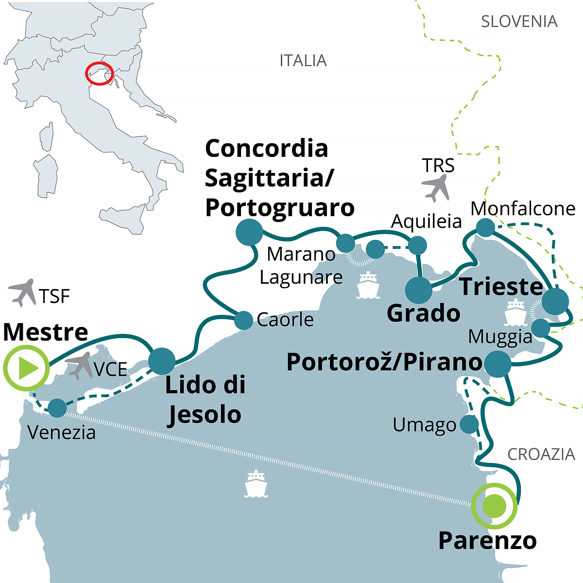 Atraktívny itinerár pozdĺž pobrežia Jadranského mora – z Benátok pôjdete na bicykloch pozdĺž pláží Jadranu cez známe prímorské letoviská ako Jesolo a Caorle, prejdete Terstom, hlavným mestom autonómneho regiónu Friuli-Venezia Giulia, s rakúsko-uhorským šarmom, a nakoniec chorvátskym poloostrovom Istrie do známej Poreče, pamiatky UNESCO.