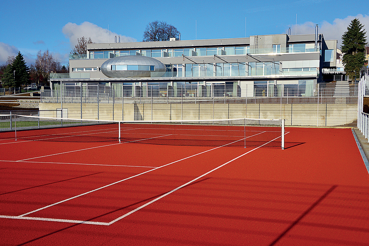 vnútorný bazén s protiprúdom a vodoliečbou; vonkajší bazén (biotop) s 20 m plaveckou dráhou, mólom, lehátkami a slnečníkmi; vnútorná vírivka až pre 10 osôb, fínska sauna, para, infrasauna*, relaxačná miestnosť s lehátkami a výhľadom; masáže*, perličkový kúpeľ*, suchá masážná vaňa*, turbosolárium*; nadštandardne vybavená posilňovňa, telocvičňa, 2x kurt na squash či badminton;