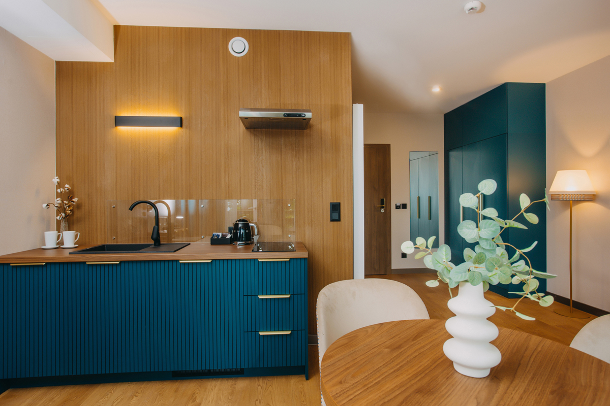 klimatizácia, TV sat., telefón, fén, chladnička, rýchlovarná kanvica, minibar (len typ Deluxe 2/3/4), súprava na kávu a čaj, kuchynský kút s varnou doskou a riadom, župany do wellness, kozmetická súprava, wi-fi pripojenie na internet