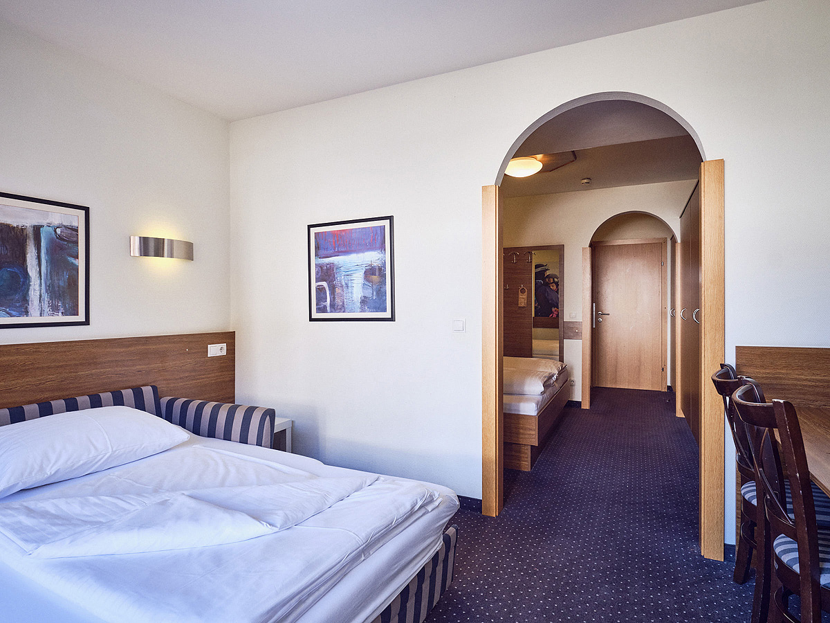 25 m² - izba s manželskou posteľou a prípadne 2 prístelkami či rozkladacou pohovkou pre 1 osobu a 1 dieťa do dovŕšených 15 rokov, sociálne zariadenie, balkón; nemožno ubytovať infanta nad maximálnu kapacitu izby!