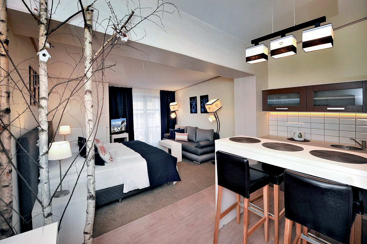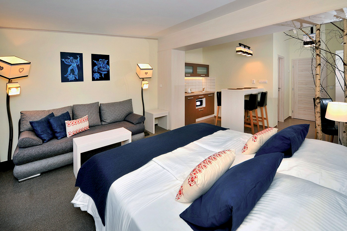 35 až 40 m² - spálňa s manželskou posteľou či 2 samostatnými lôžkami, obývacia izba s kuchynským kútom a rozkladacím gaučom pre 2 osoby, predsieň, sociálne zariadenie