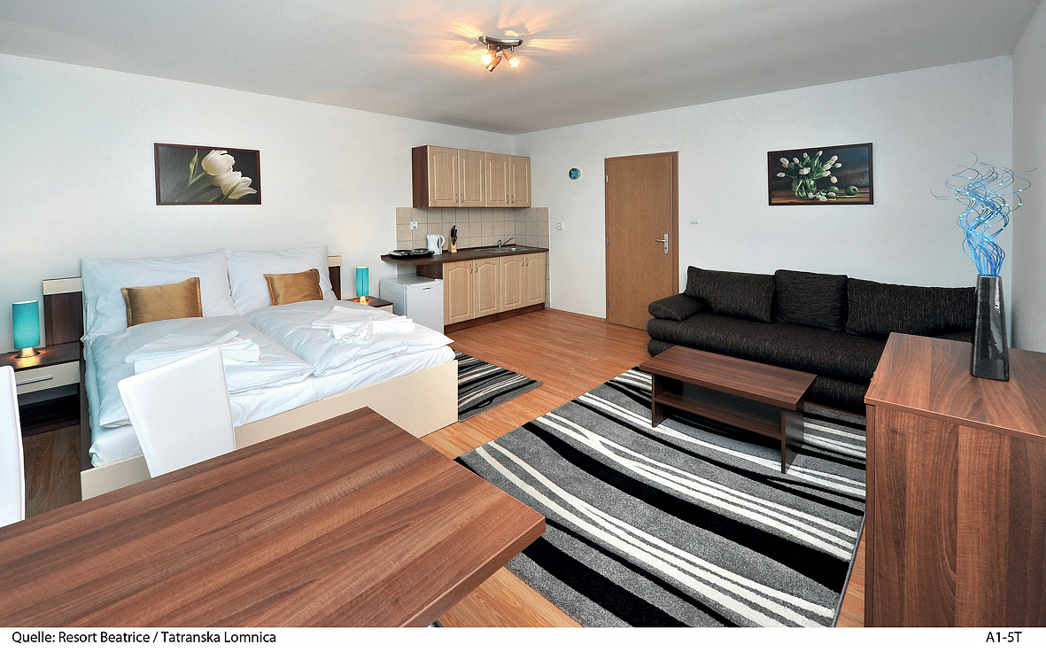 28 m² - obývacia časť apartmánu s rozkladacím gaučom pre 2 osoby či manželskou posteľou, kuchyňa, jedálenský kút, sociálne zariadenie so sprchou