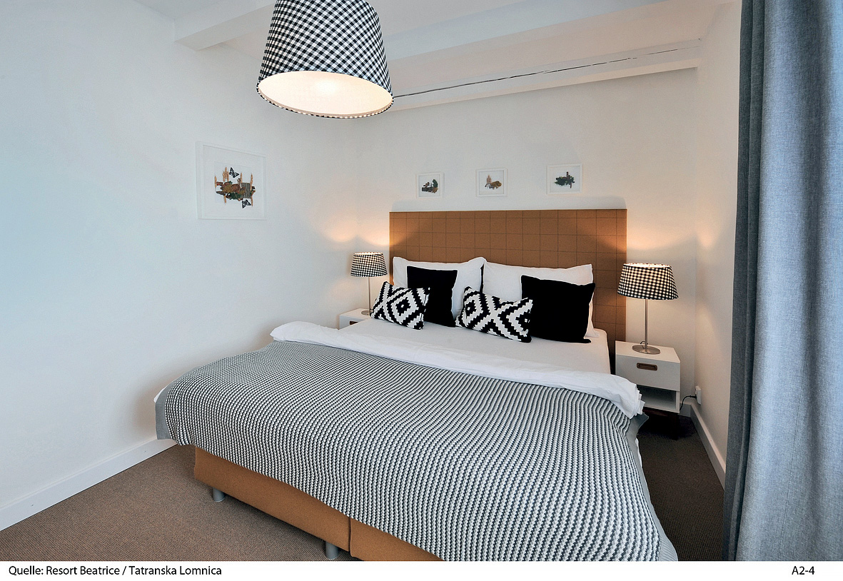 45 m² - 1 spálňa s manželskou posteľou (môže byť i formou mazonetu) a 1 samostatným lôžkom, obývacia izba s kuchynským kútom a rozkladacím gaučom pre 2 osoby, sociálne zariadenie spravidla so sprchou, balkón