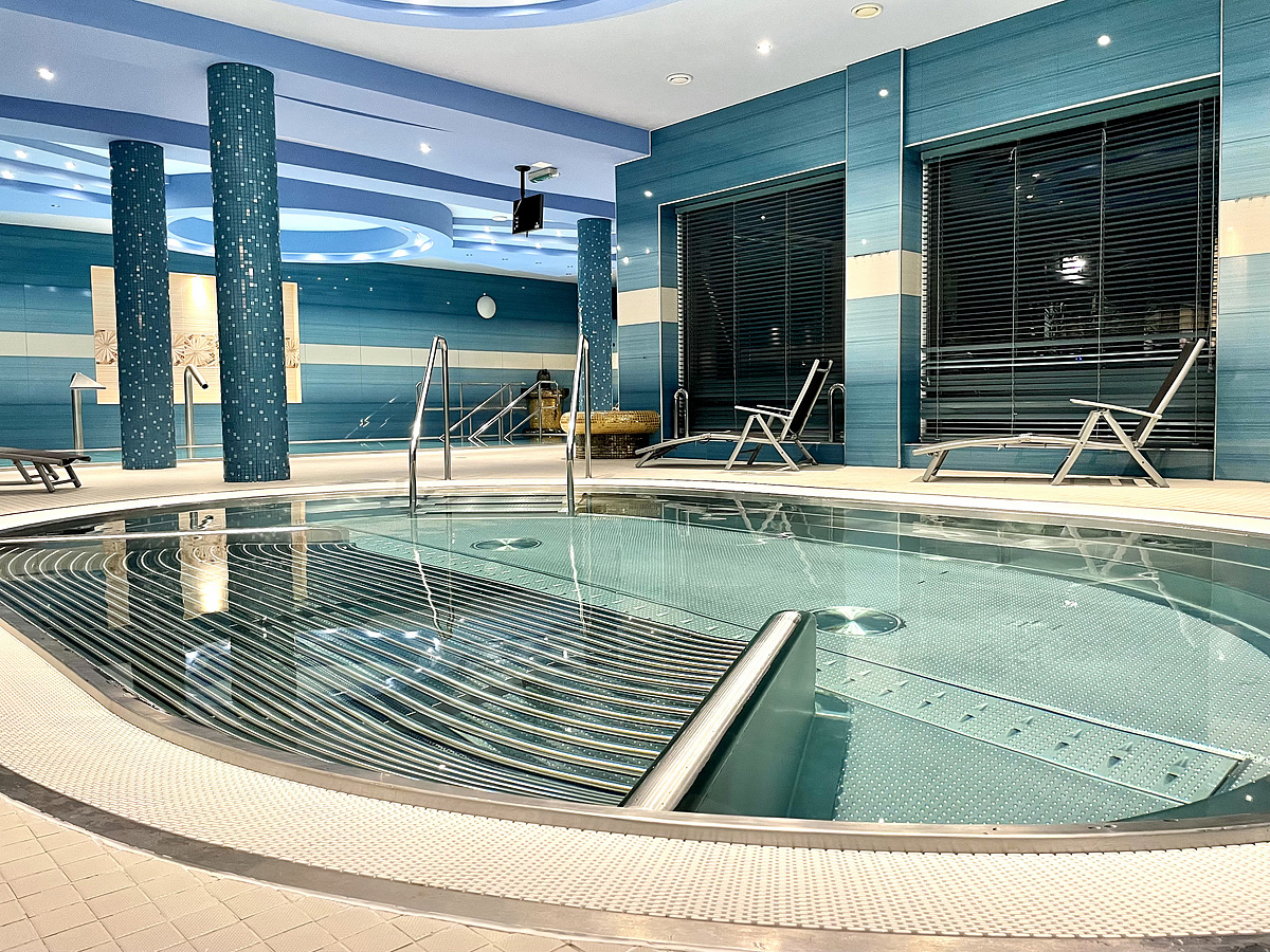 bazén* s vodnými prvkami a lehátkami, vírivka*, fínska sauna*, para*, hammam*, relaxačný kútik* s vyhrievanými lehátkami, soľná kabína*, masáže*, beauty procedúry*