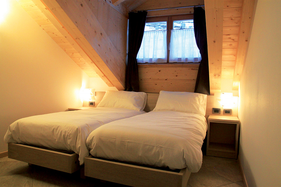55 m² - 2 spálne s manželskou posteľou s oddeliteľnými lôžkami, obývacia izba s kuchynským kútom a rozkladacím gaučom pre 2 osoby, predsieň, sociálne zariadenie, balkón; apartmány sú dvojpodlažné