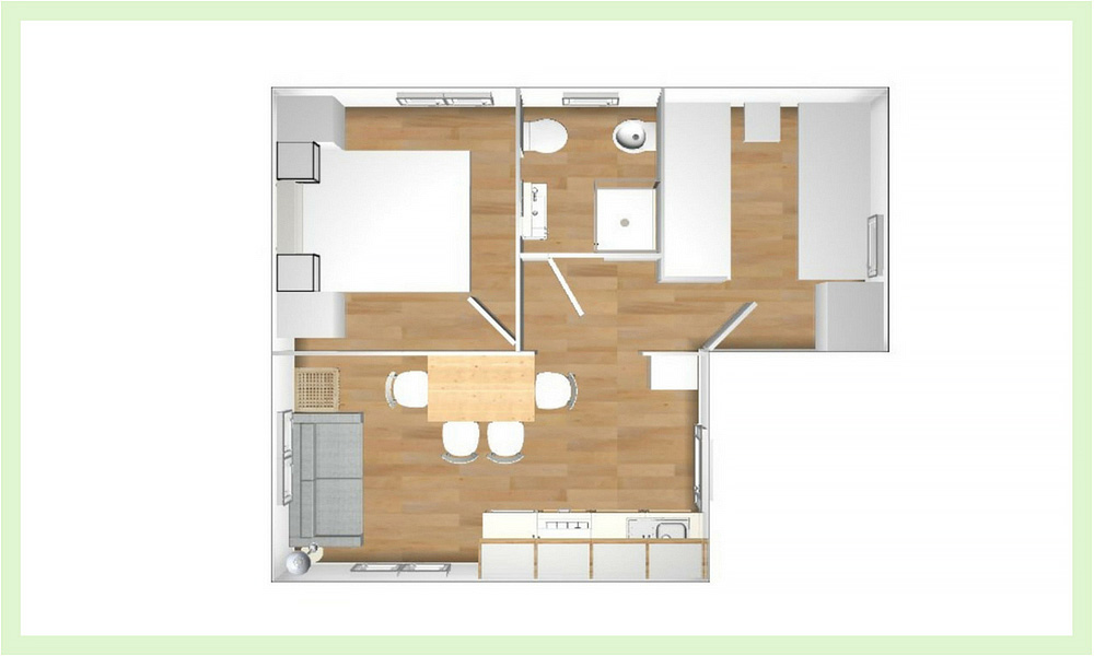 bilo 2 - 17 až 19 m² - 1 spálňa s manželskou posteľou, obývacia izba s kuchynským kútom, sociálne zariadenie, terasa