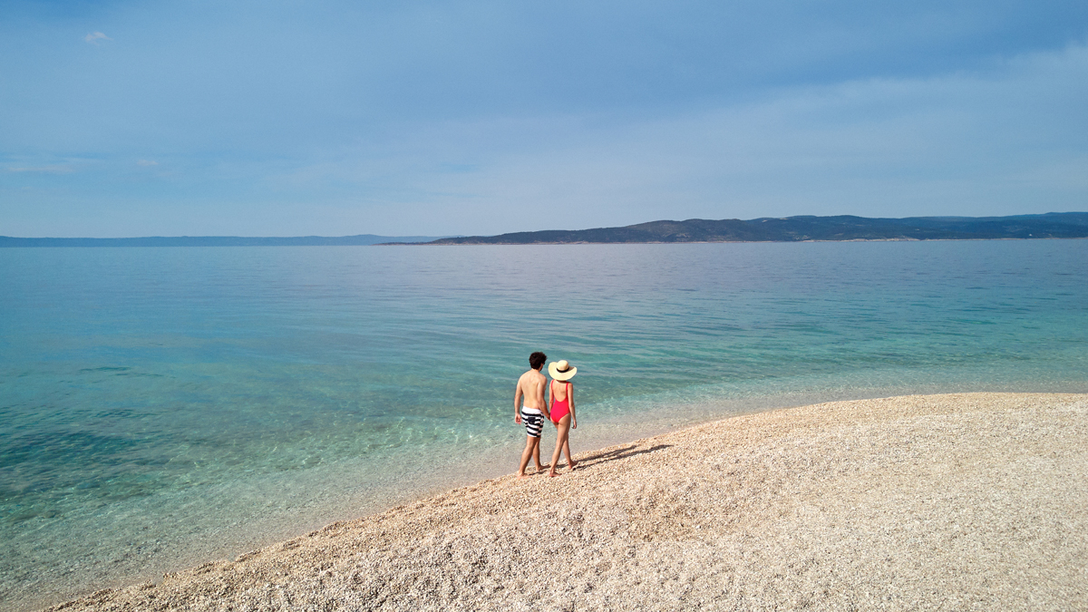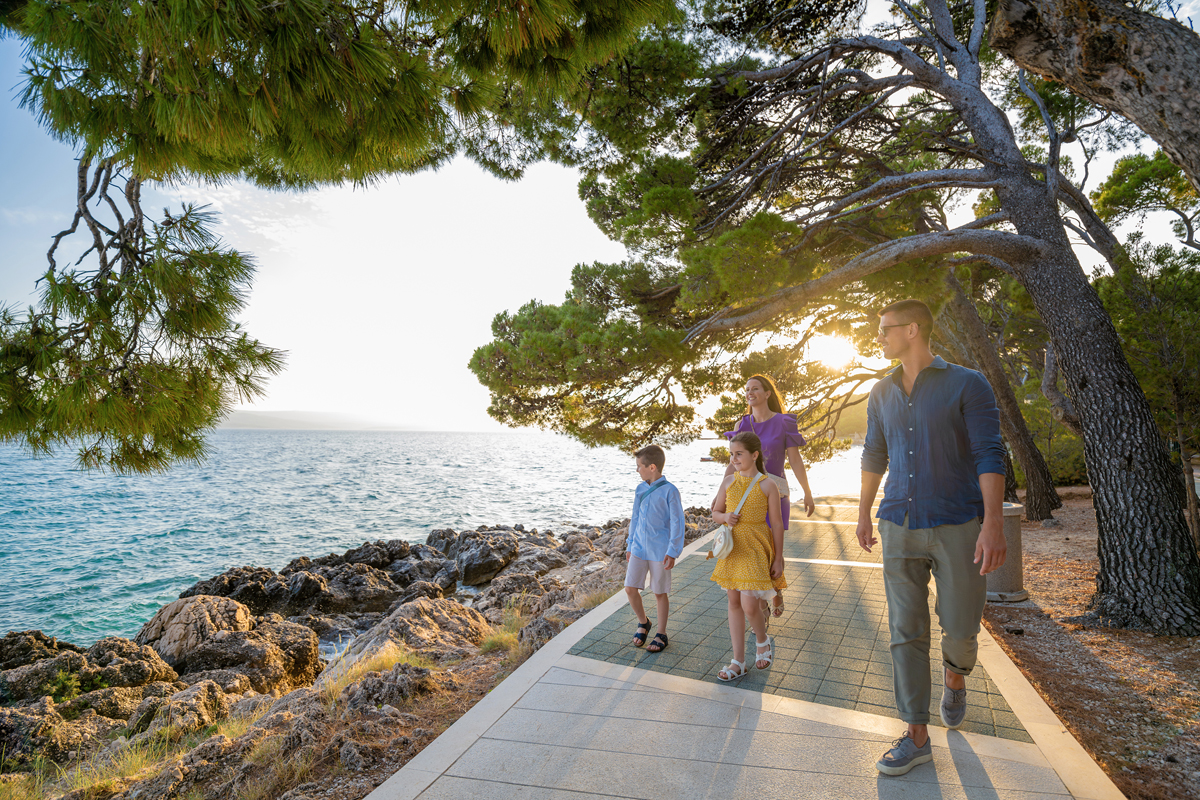 Brela, pláž Maestral / široká kamienková s pozvoľným vstupom do mora – 50 m, pláž Punta Rata – 400 m, centrum – 400 m, Baška Voda – 3 km, letisko Split – 70 km
