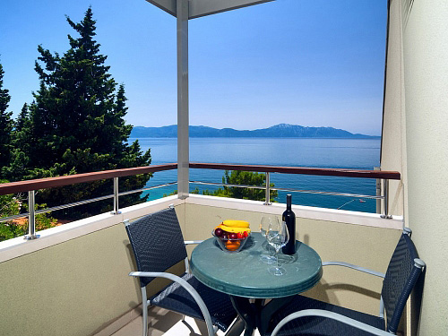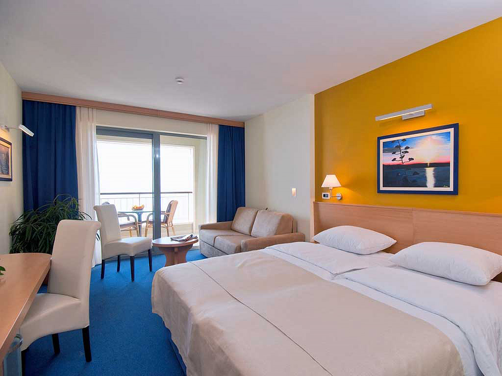 izba s manželskou posteľou s možnosťou prístelky pre jednu osobu, sociálne zariadenie s vaňou, balkón s výhľadom na more
