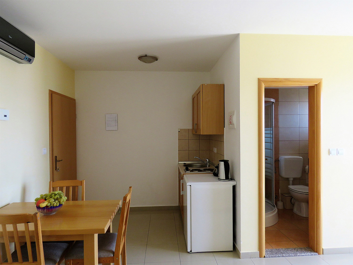 obývacia izba s kuchynským kútom a manželskou posteľou, sociálne zariadenie so sprchou, možnosť 1 prístelky formou rozkladacieho gauča, balkón s výhľadom na more