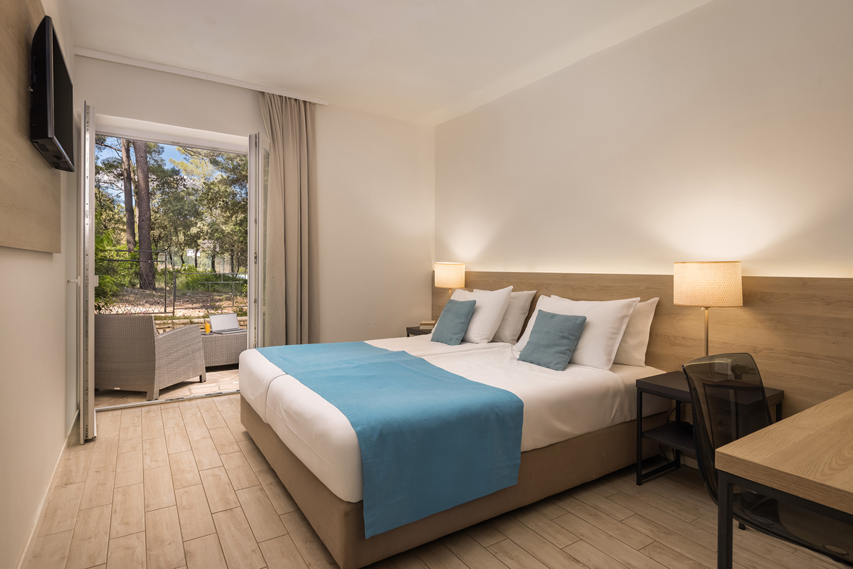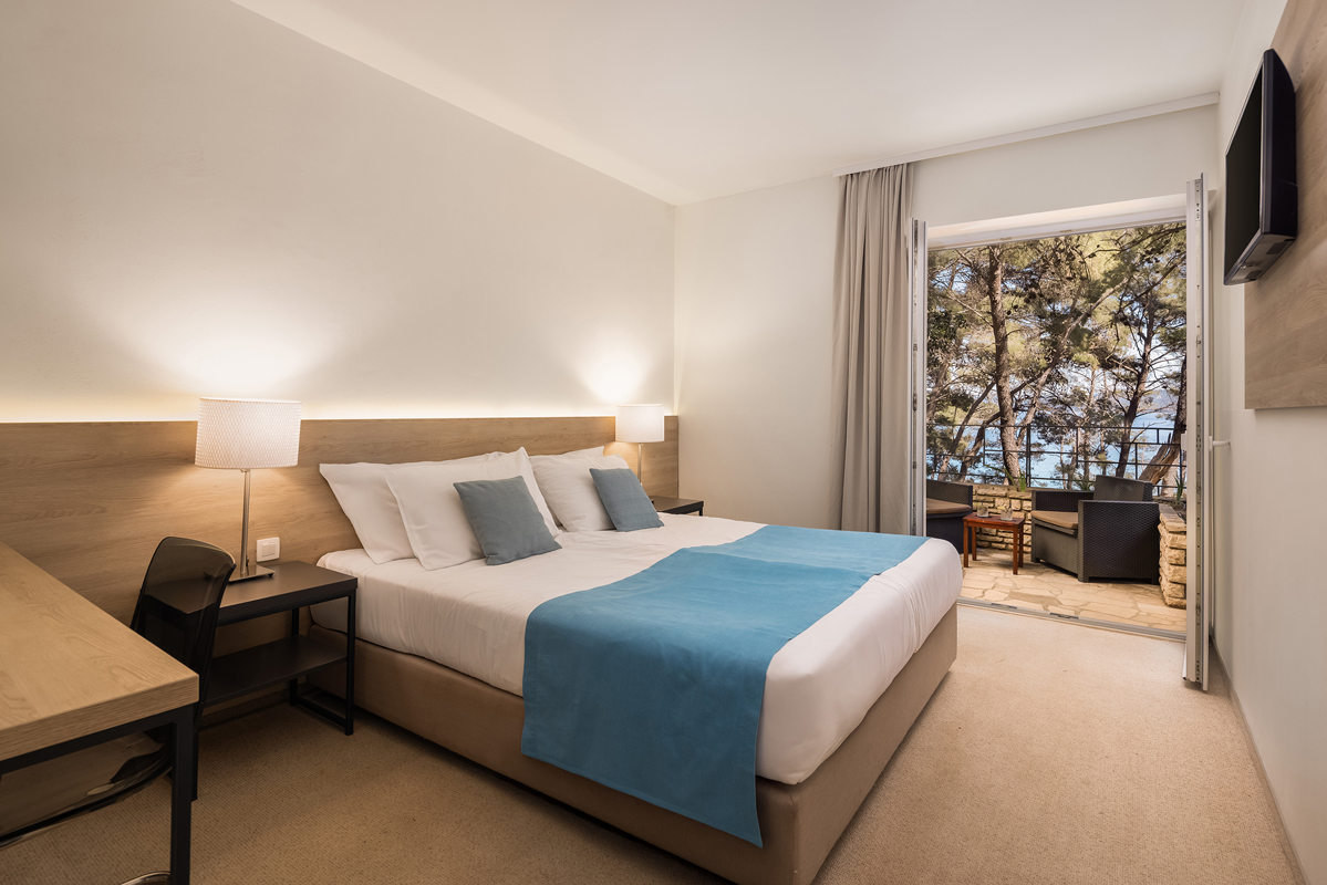 Superior 2/3 balkon M - izba s manželskou posteľou, poprípade dvomi oddelenými lôžkami, možnosť prístelky formou rozkladacieho lôžka, sociálne zariadenie so sprchou, balkón s výhľadom na more