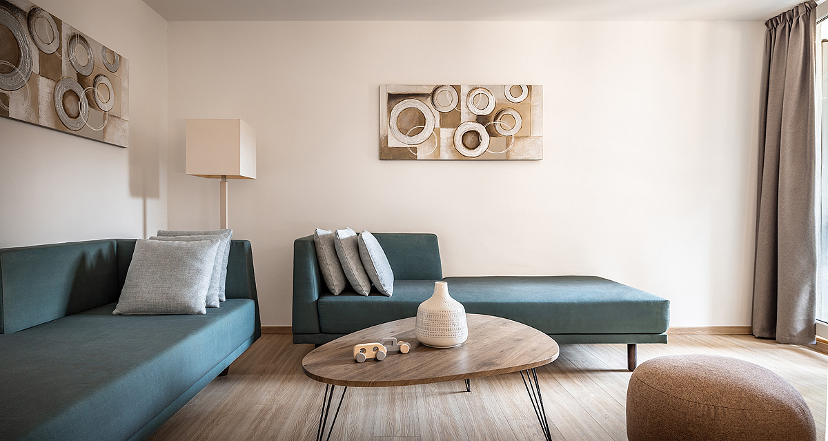 25 až 27 m² - izba s manželskou posteľou a detskou časťou s možnosťou oddelenia závesom (rozkladací gauč alebo poschodová posteľ pre 2 deti do nedovŕšených 18 rokov), sociálne zariadenie, balkón orientovaný na more