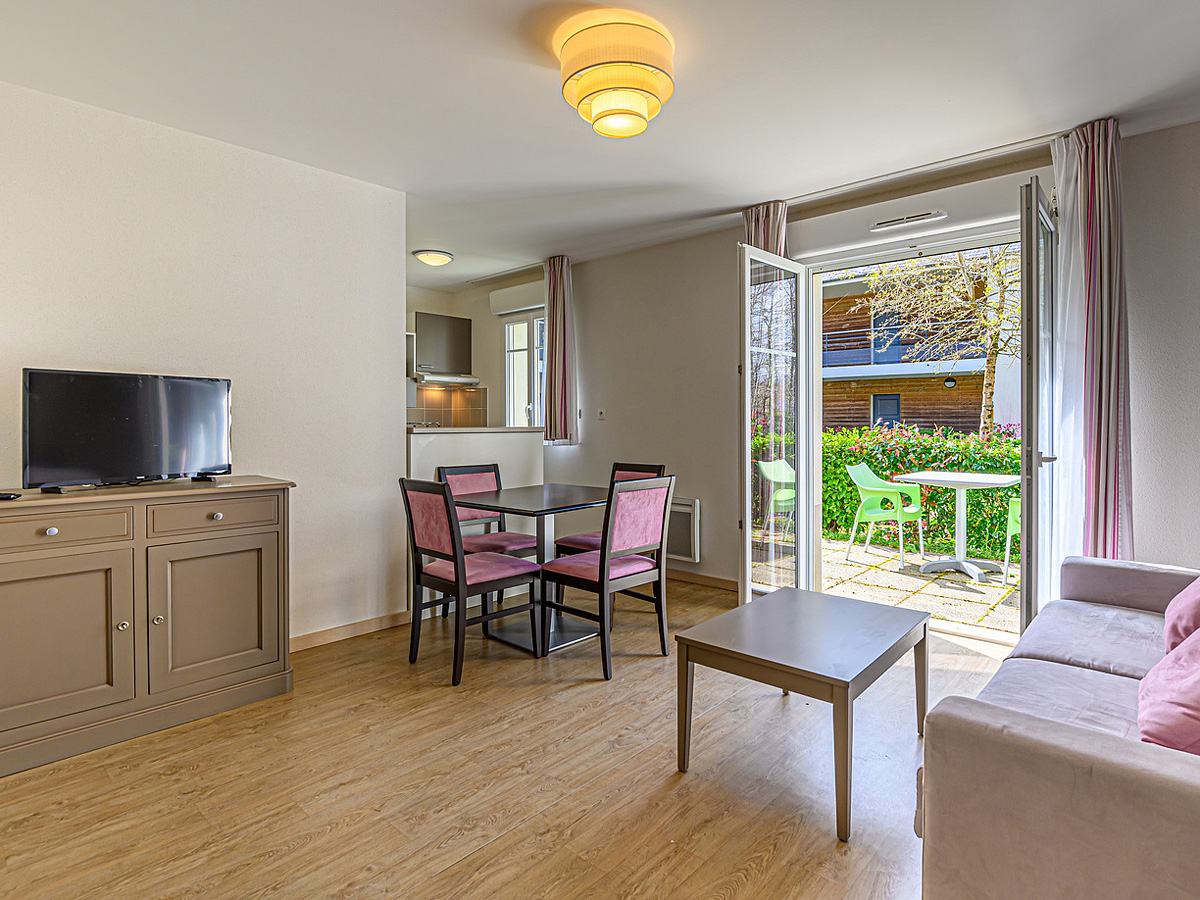 43 m² - spálňa s manželskou posteľou či dvomi oddelenými lôžkami, obývacia izba s kuchynským kútom a rozkladacím gaučom pre 2 osoby (možný i typ "zásuvka"), sociálne zariadenie, terasa alebo balkón