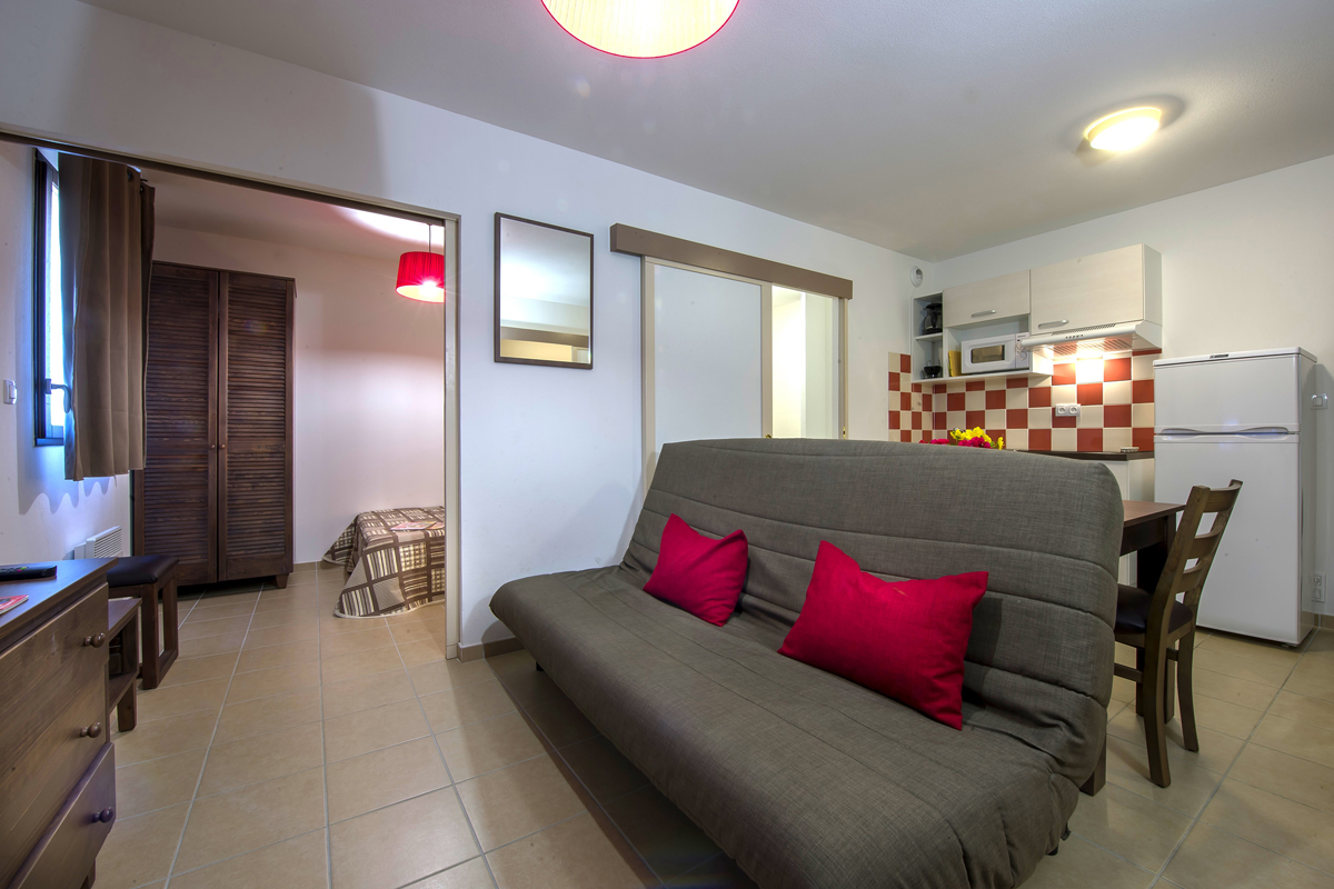 studio 4 - 35 m² - obývacia izba s kuchynským kútom a rozkladacím gaučom pre 2 osoby (možný aj typ „zásuvka“), kabína s poschodovou posteľou pre 2 osoby, sociálne zariadenie so sprchou a WC, terasa alebo balkón