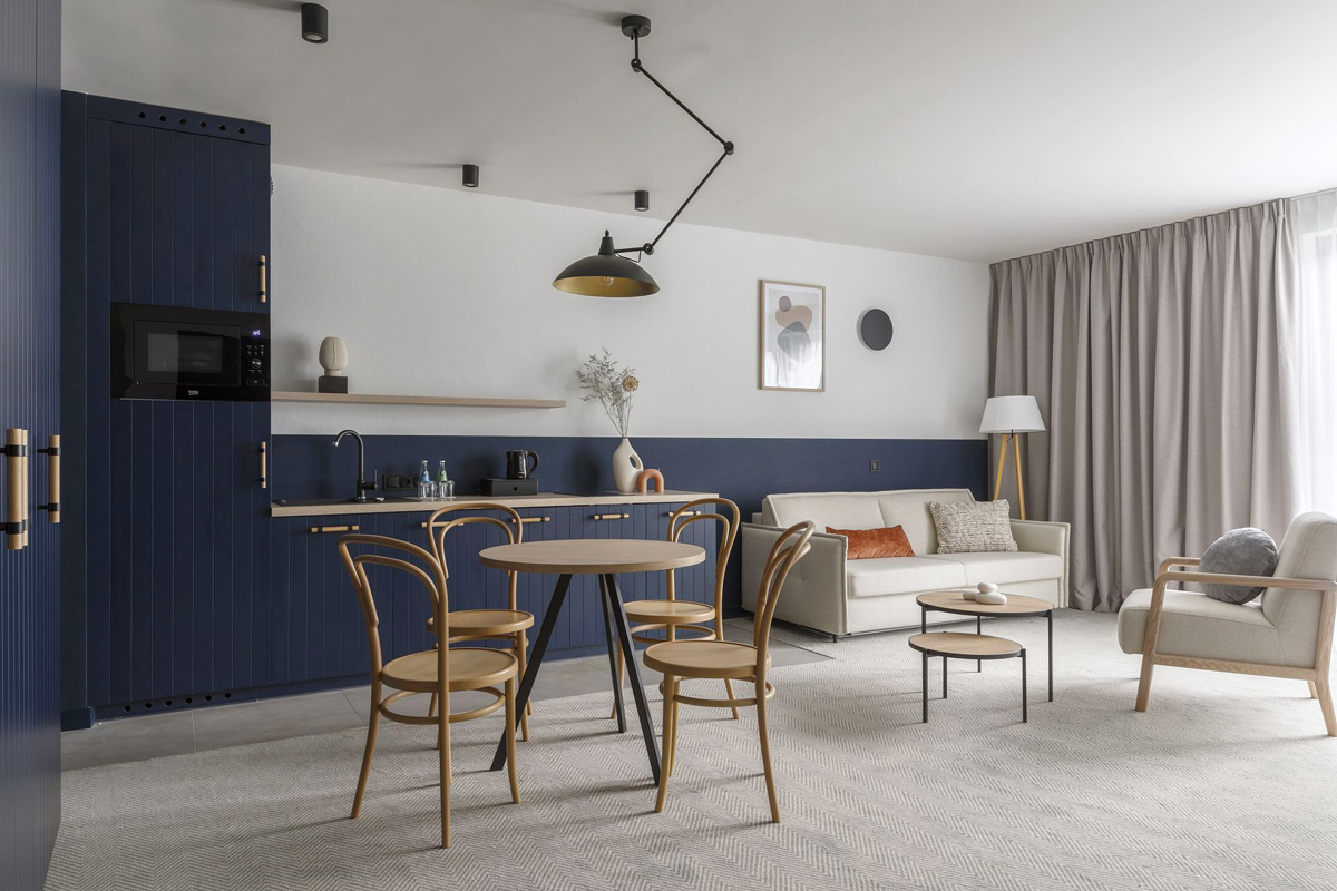 30 až 45 m² – spálňa s manželskou posteľou typu Queen size bed, obývacia izba s rozkladacím gaučom ako prístelkou až pre 2 osoby, kuchynský kút, sociálne zariadenie, balkón alebo terasa