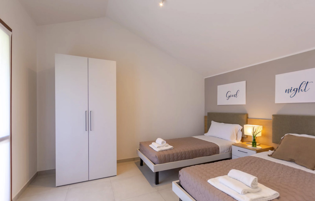 quadri 6 V4P bazén - 100 m² – polovica dvojpodlažnej vily; prízemie: 1 spálňa s manželskou posteľou, obývacia izba s kuchynským kútom, sociálne zariadenie so sprchou, veranda s vonkajším krbom a grilom, záhrada so súkromným bazénom; poschodie: 1 spálňa s manželskou posteľou, 1 spálňa s 2 samostatnými lôžkami alebo poschodovou posteľou, sociálne zariadenie so sprchou; 2 parkovacie miesta pri dome; na požiadanie možnosť 7. osoby na prístelke*