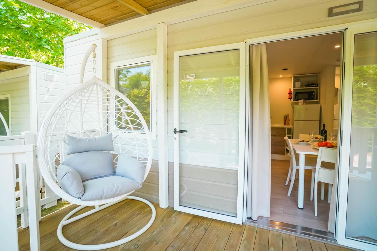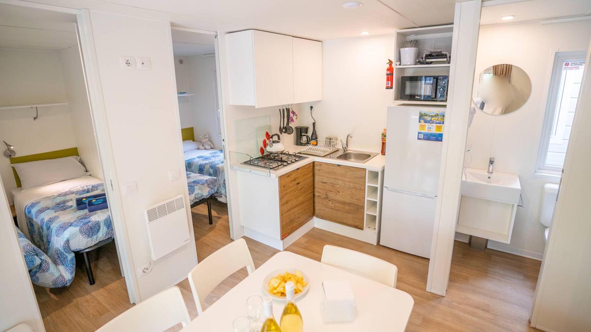 29 m² - spálňa s manželskou posteľou, 2 spálne s 2 samostatnými lôžkami, obývacia časť s kuchynským kútom, 2x sociálne zariadenie so sprchou, zastrešená drevená terasa