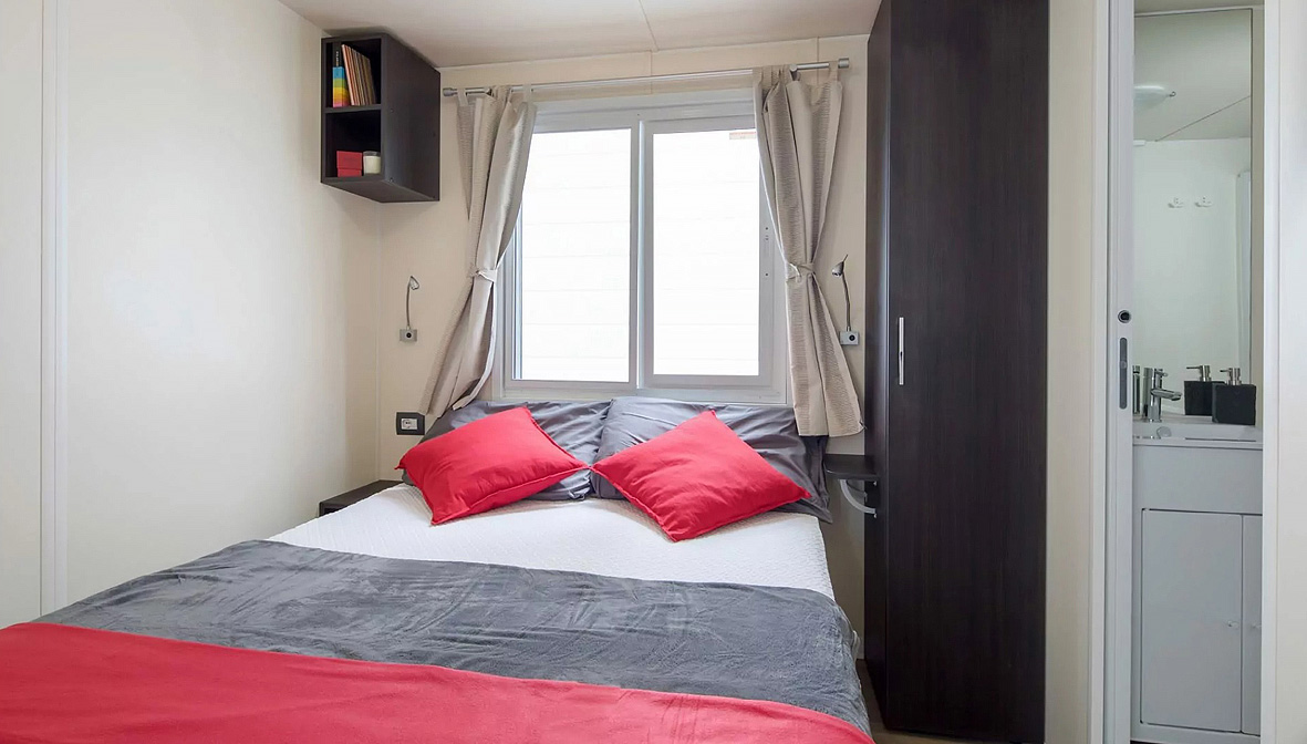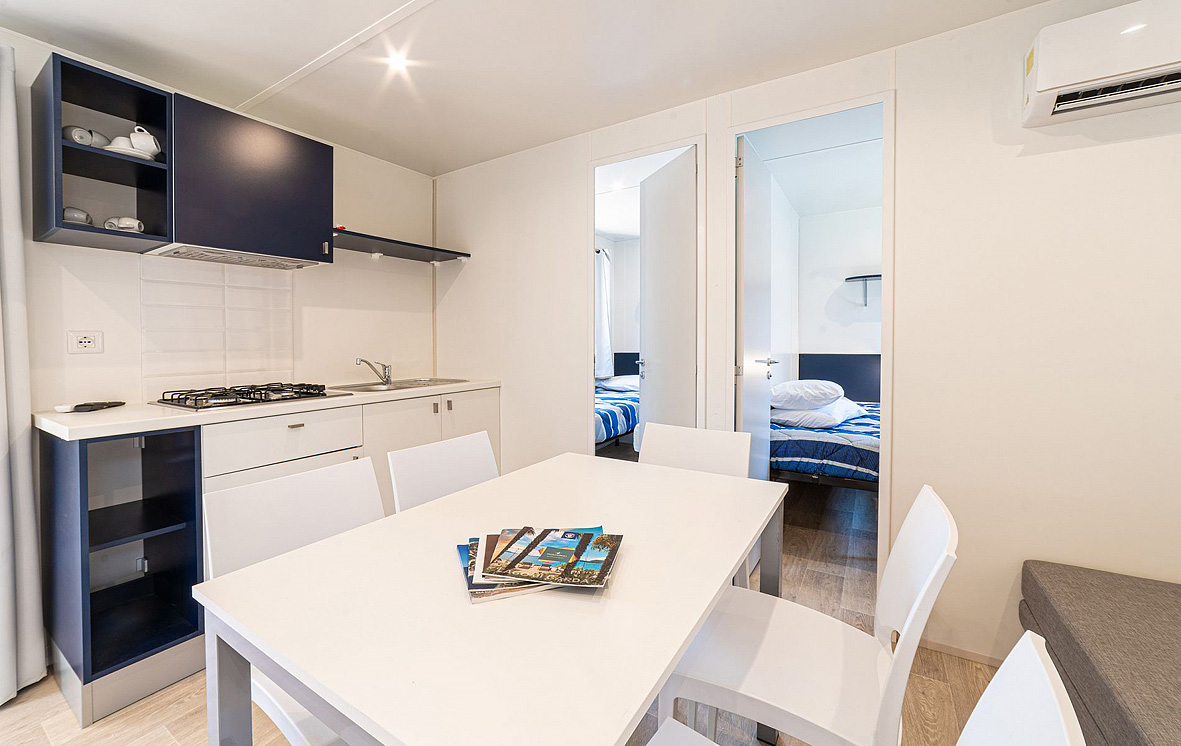 mobilhome Baia Sardinia 6 - 32 m² - 1 spálňa s manželskou posteľou, 2 spálne s 2 samostatnými lôžkami, obývacia izba s kuchynským kútom, 2x sociálne zariadenie (jedno len s WC), terasa