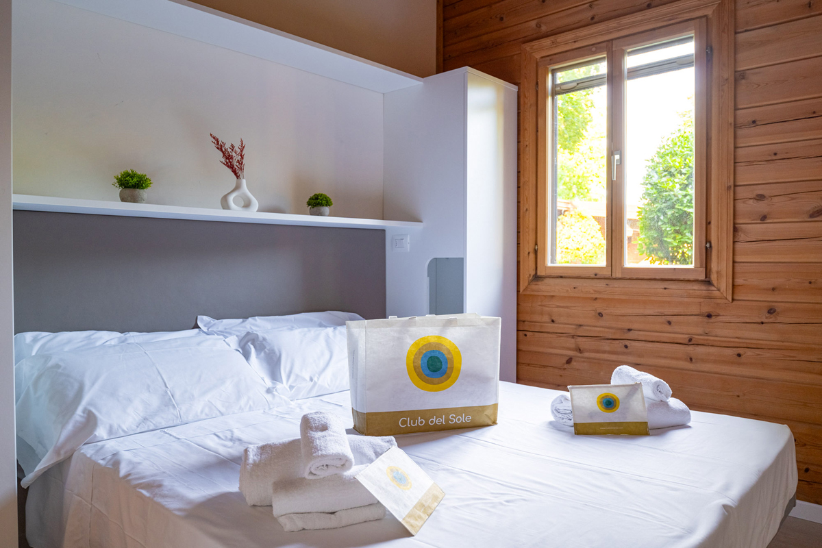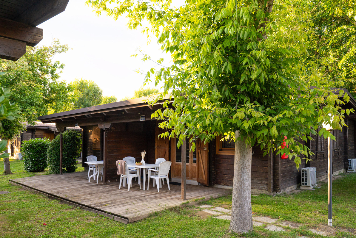 27 m² – spálňa s manželskou posteľou, obývacia časť s kuchynským kútom a rozkladacou pohovkou pre 2 deti do nedovŕšených 10 rokov, sociálne zariadenie so sprchou, krytá drevená terasa
