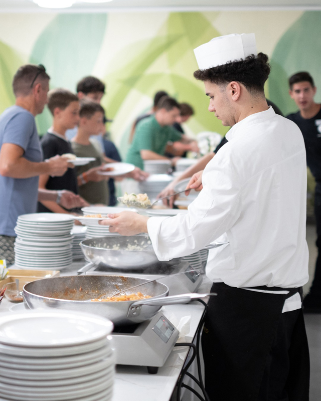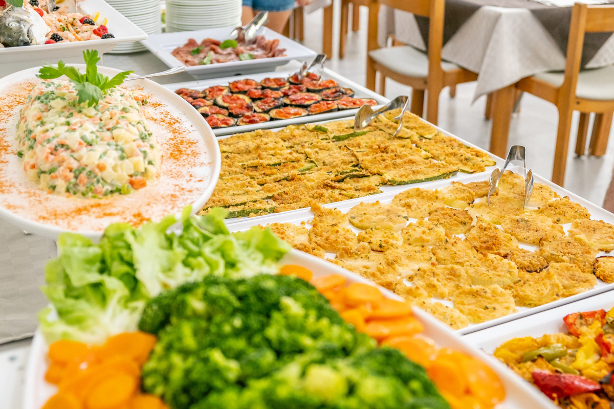 večera - spravidla servírovaná, výber z menu, šalátový bufet, ovocie alebo dezert, v cene 1/2 l vody a 1/4 l vína