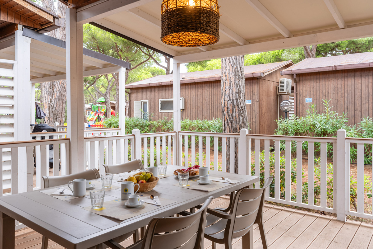 mobilhome Comfort plus 5+1 - 30 m² - 1 spálňa s manželskou posteľou, 1 spálňa s 2 samostatnými lôžkami a 1 zaveseným lôžkom pre dieťa do nedovŕšených 10 rokov, obytná časť s kuchynským kútom a lavicou prestaviteľnou na lôžko, sociálne zariadenie so sprchou, krytá drevená terasa