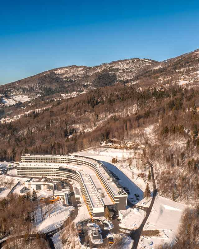 nový a ekologicky navrhnutý hotelový komplex v poľských Beskýdoch s panoramatickým výhľadom na horský masív
