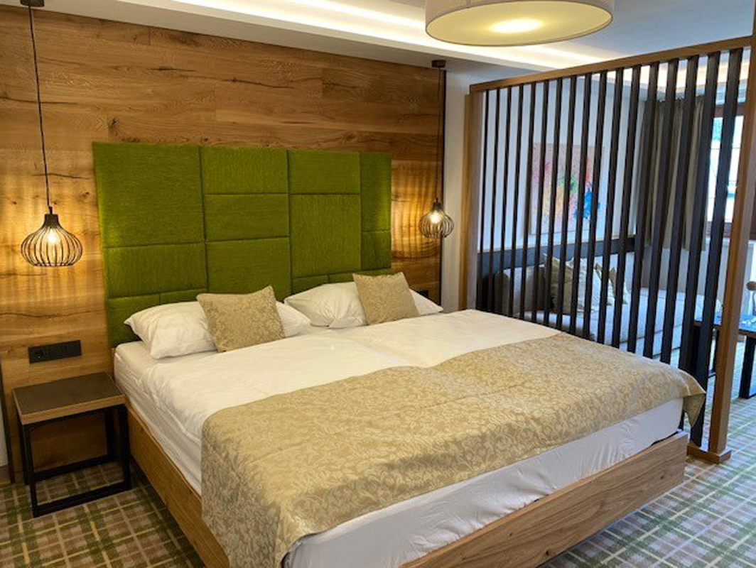 Deluxe 4 typ A - 35 m² - izba s manželskou posteľou a prípadne rozkladacím gaučom až pre 2 osoby, sociálne zariadenie s vaňou alebo sprchou, balkón; izby sú vždy v novej časti hotela pristavané v roku 2016