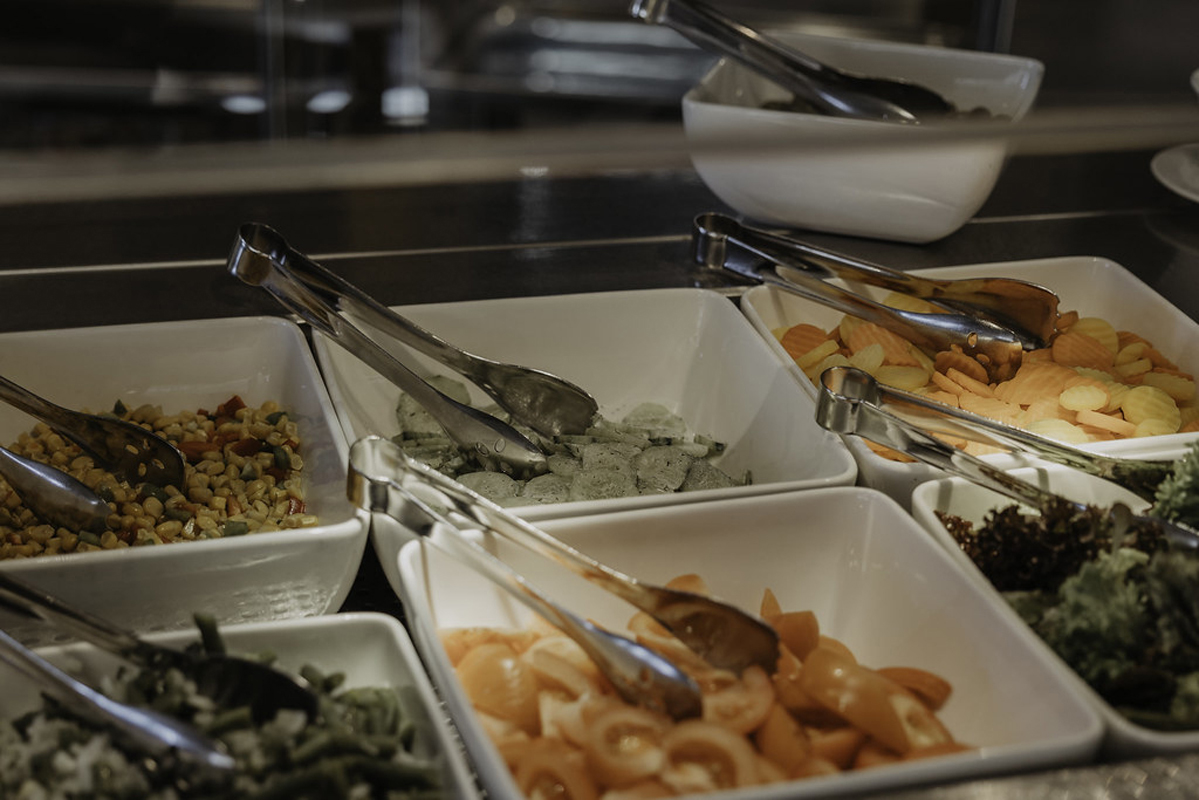 formou bufetu s výberom hlavného jedla s prílohou, predjedla alebo polievky, šaláty a dezerty formou bufetu, nápoje za poplatok