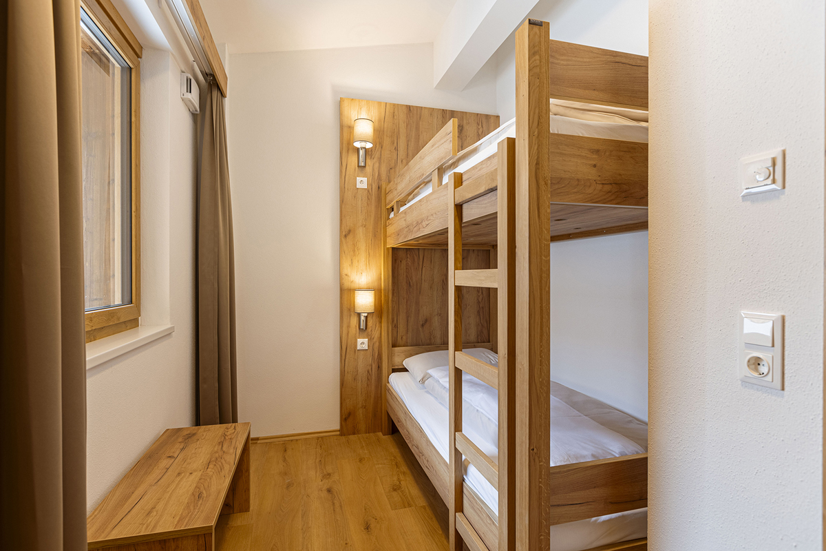 84 až 87 m² - 2 spálne s manželskou posteľou, spálňa s poschodovou posteľou pre 2 osoby, obývacia izba s kuchynským kútom, 2× sociálne zariadenie, balkón alebo terasa