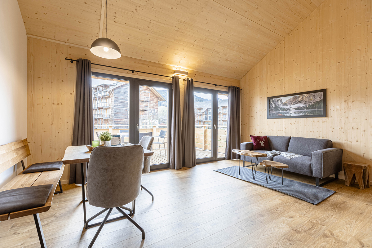 60 m² - 2 spálne s manželskou posteľou, neuzavretá spálňa s manželskou posteľou, obývacia izba s kuchynským kútom, sociálne zariadenie, infra sauna, terasa s vírivkou