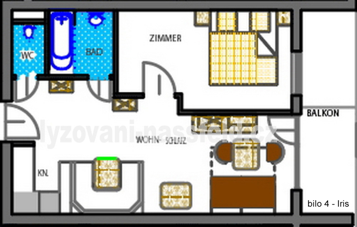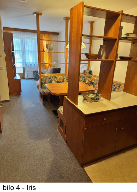 41 m² - spálňa s manželskou posteľou, obývacia izba s kuchynským kútom a rozkladacím gaučom pre 2 osoby, predsieň, sociálne zariadenie, oddelené WC, balkón; apartmán je na 3. poschodí