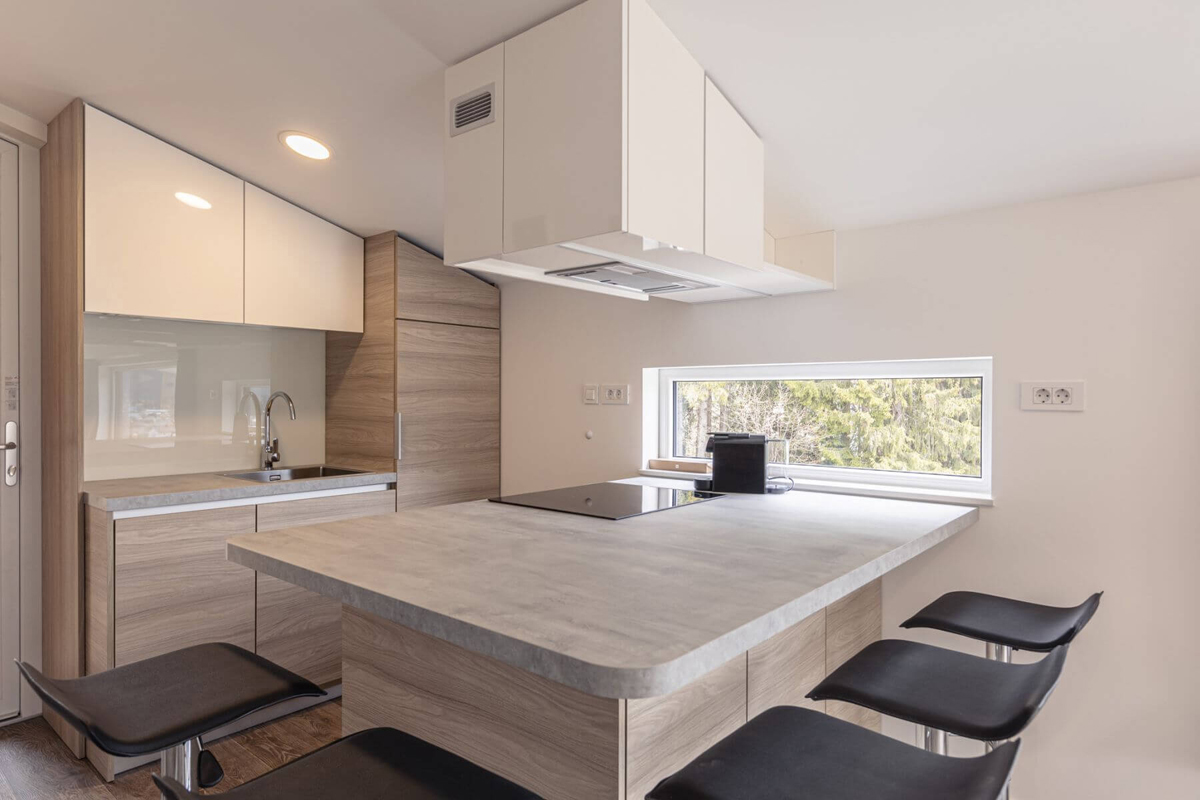 22,5 m² - obývacia izba s kuchynským kútom, manželskou posteľou a rozkladacím gaučom pre 1 dieťa do nedovŕšených 13 rokov, sociálne zariadenie, terasa; apartmán stojí na vysokých pilieroch a je prístupný len po schodoch