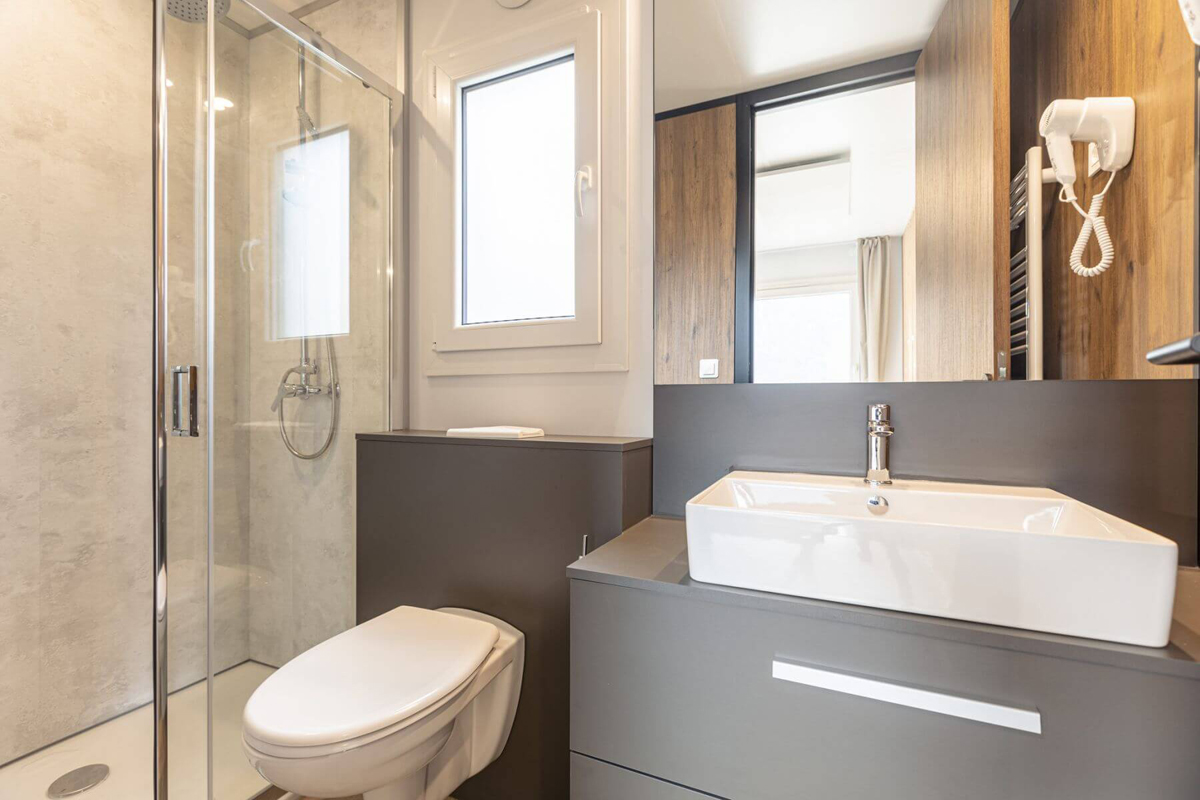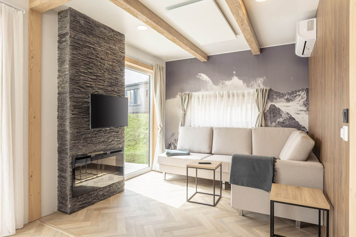 60 m² - 3 spálne s manželskou posteľou alebo 2 samostatnými lôžkami či poschodovou posteľou pre 2 osoby (zvyčajne 1× manželská posteľ, 1× poschodová posteľ a 1 spálňa s 2 samostatnými lôžkami), obývacia izba s kuchynským kútom, sociálne zariadenie, oddelené WC, terasa