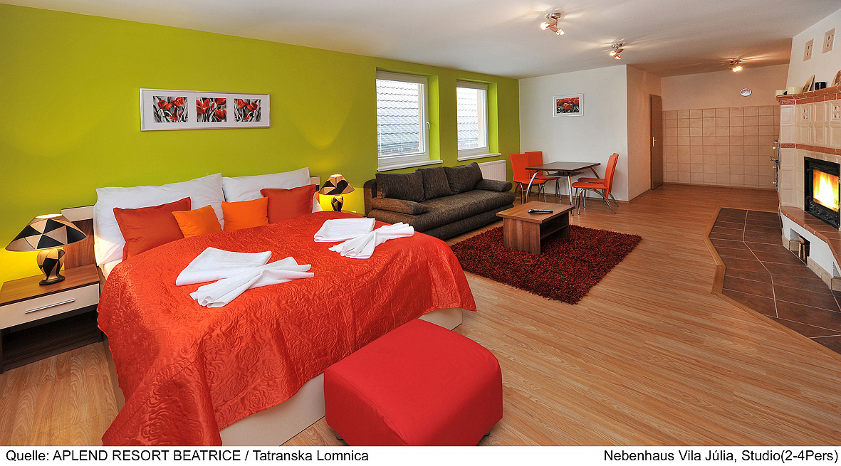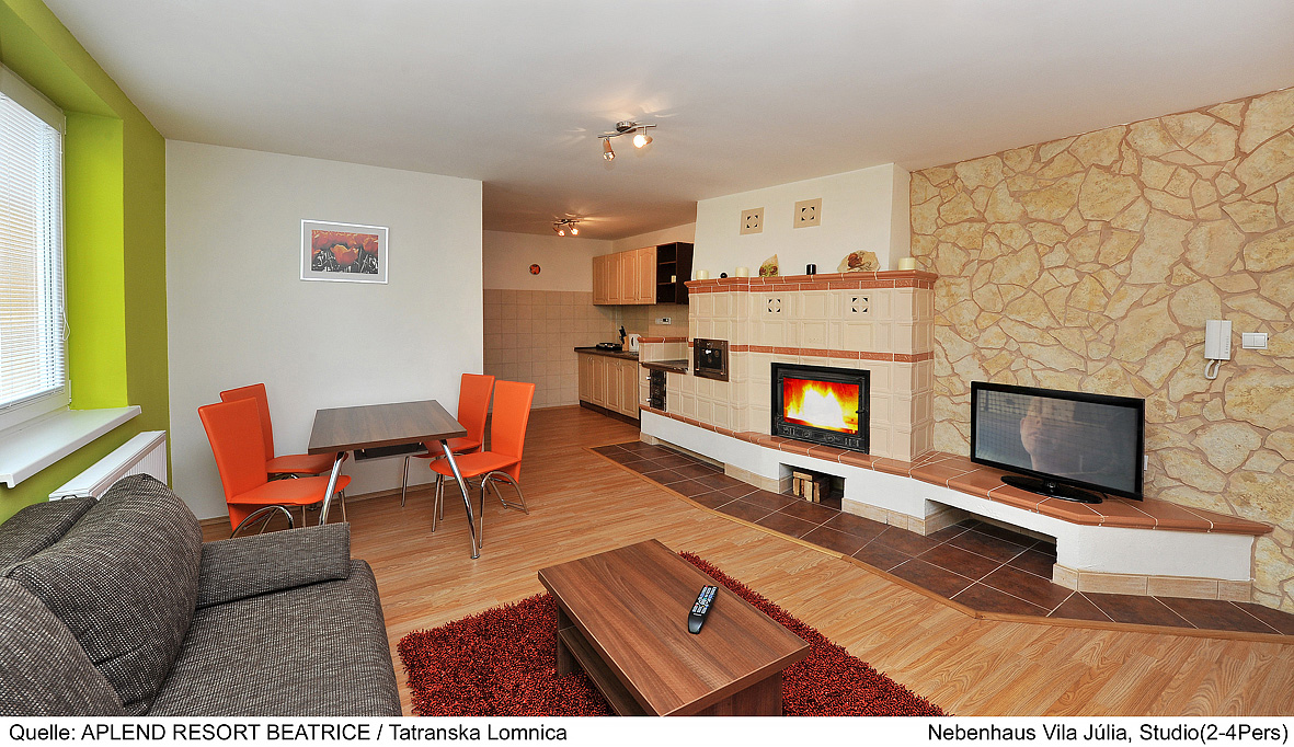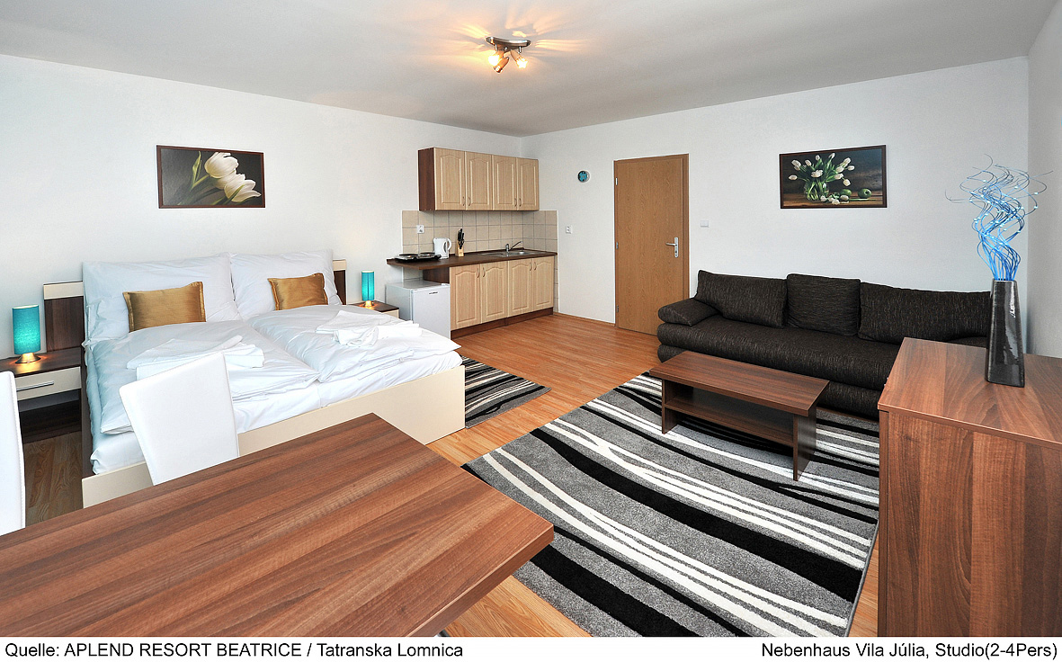 mono 2/3/4 typ B - 25 m² - obývacia izba s manželskou posteľou a rozkladacím gaučom pre 2 osoby, kuchyňa, jedálny kút, sociálne zariadenie so sprchou; všetky apartmány sa nachádzajú v prízemí