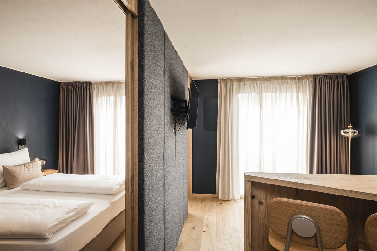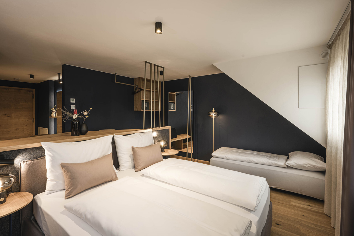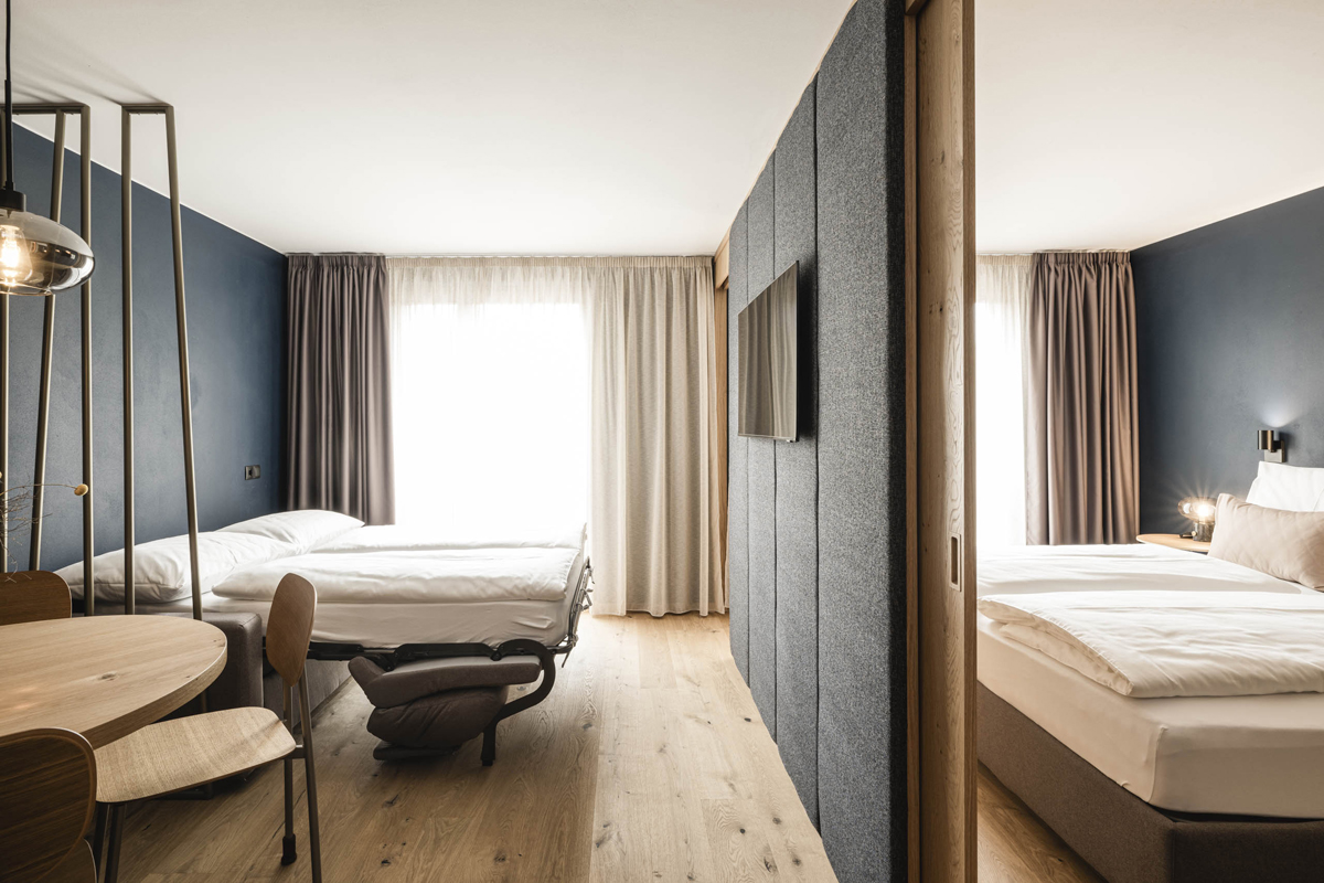trilo 4 - 50 m² – 1 spálňa s manželskou posteľou, 1 spálňa s posuvnými dverami a rozkladacím gaučom pre 2 osoby, obývacia izba s kuchynským kútom, sociálne zariadenie, balkón
