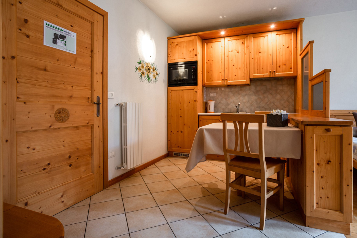 42 m² - 1 spálňa s manželskou posteľou, obývacia izba s kuchynským kútom a rozkladacím gaučom pre 2 osoby, sociálne zariadenie so sprchou, balkón; jeden apartmán je menší a má kuchyňu vo vyvýšenom podlaží prístupnú po schodoch