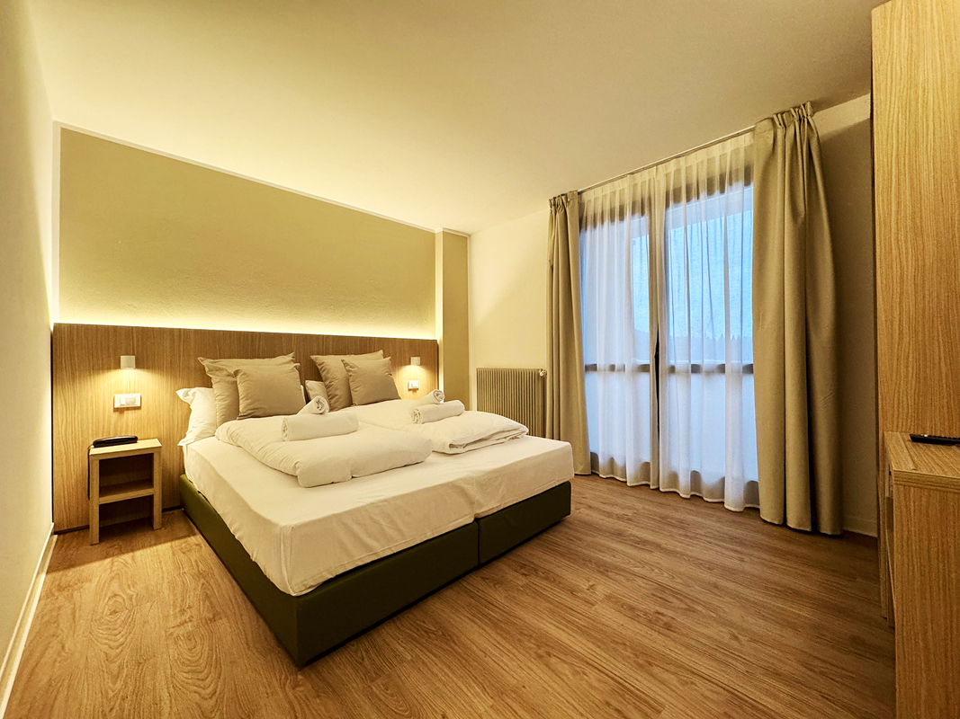 izba s manželskou posteľou alebo 2 samostatnými lôžkami a prípadne 1 alebo 2 ďalšími samostatnými lôžkami alebo rozkladacím gaučom typu „zásuvka“ pre 2 osoby, sociálne zariadenie so sprchou, balkón