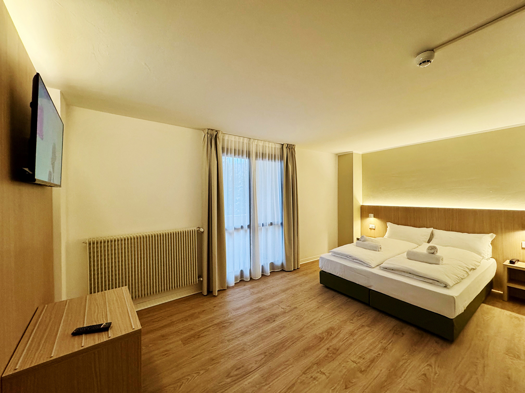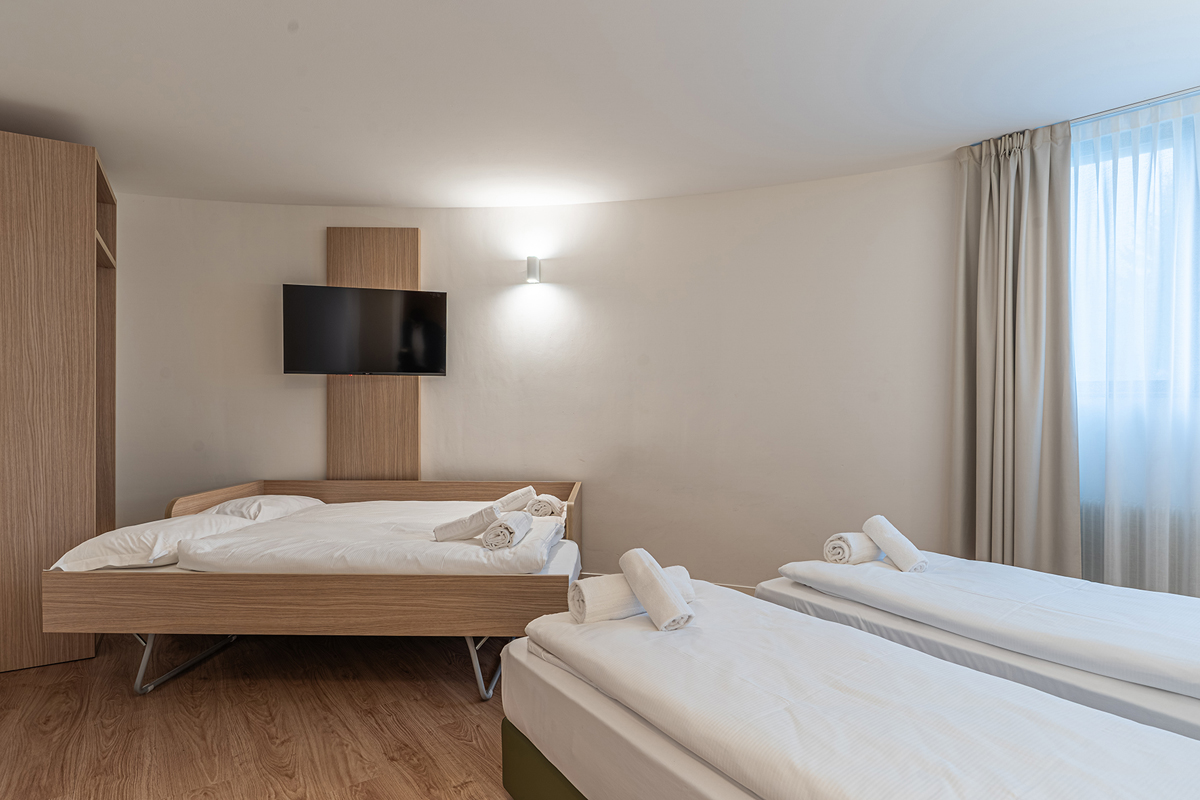 izba s manželskou posteľou alebo 2 samostatnými lôžkami a prípadne jedným samostatným lôžkom, izba s rozkladacím gaučom pre 2 osoby alebo poschodovou posteľou, sociálne zariadenie so sprchou, balkón