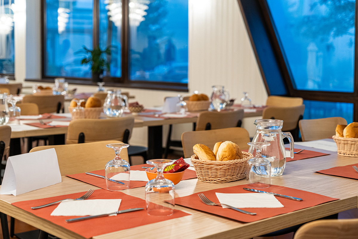 servírované menu s výberom z 3 teplých predjedál a 3 hlavných jedál s prílohou, šalátový bufet, dezert alebo ovocie; nápoje za poplatok