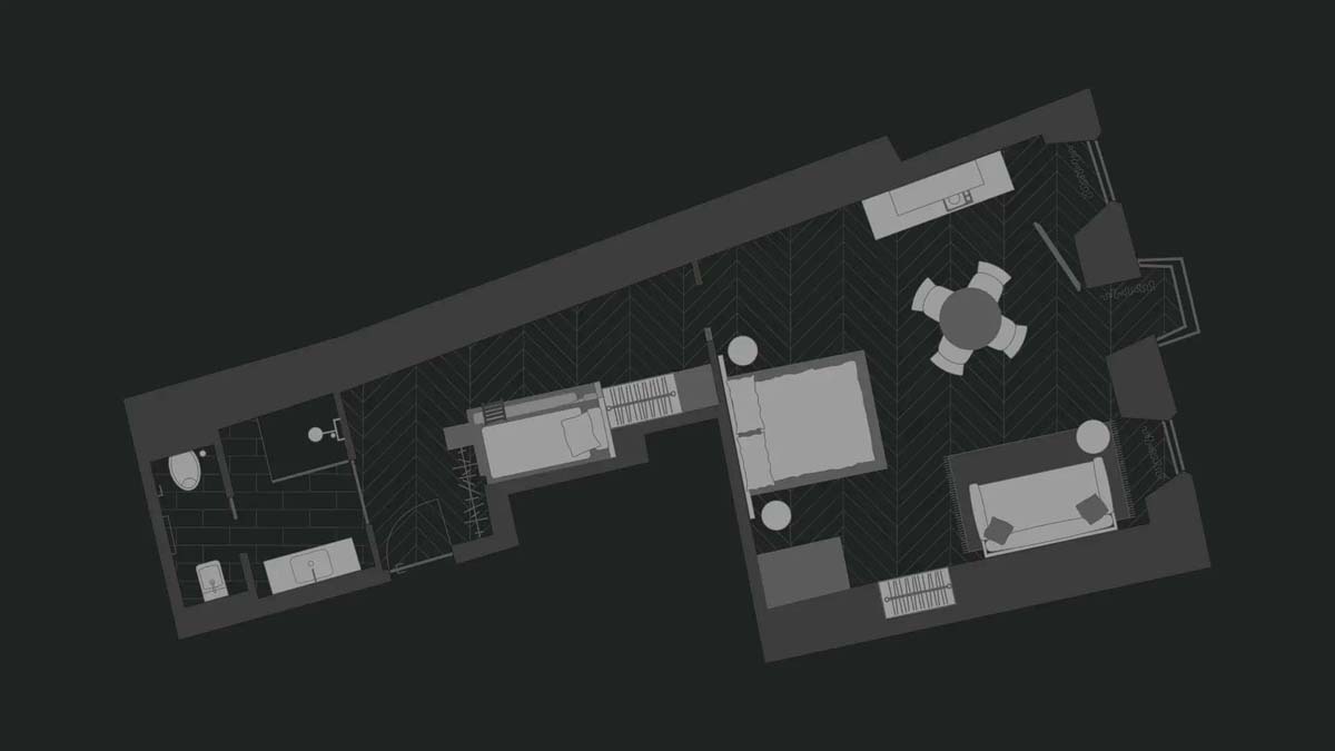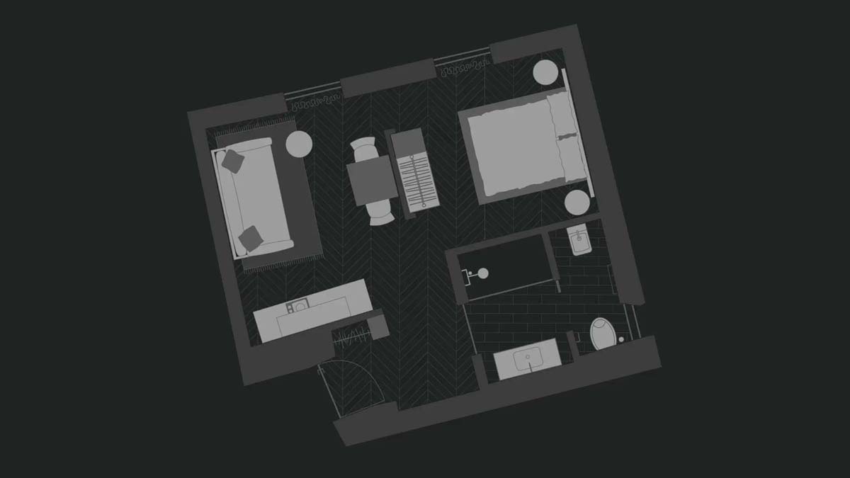 40 m² – obývacia izba s kuchynským kútom s čiastočne oddelenou manželskou posteľou, sociálne zariadenie