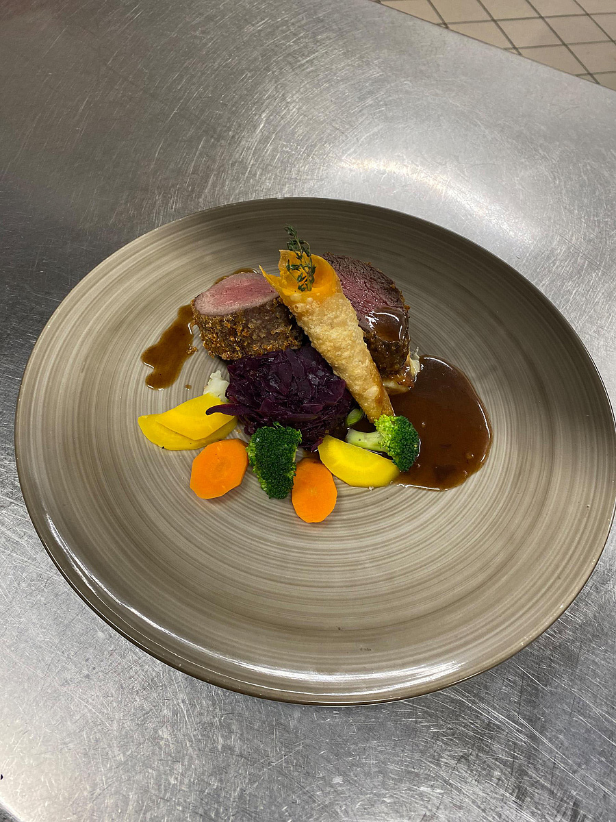 servírované menu s výberom z 2 teplých predjedál a 2 hlavných jedál s prílohou, servírovaný dezert; raz týždenne typická tematická večera