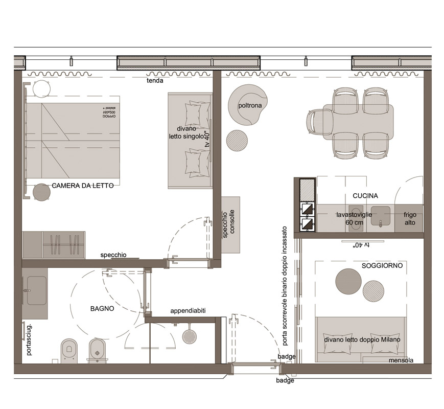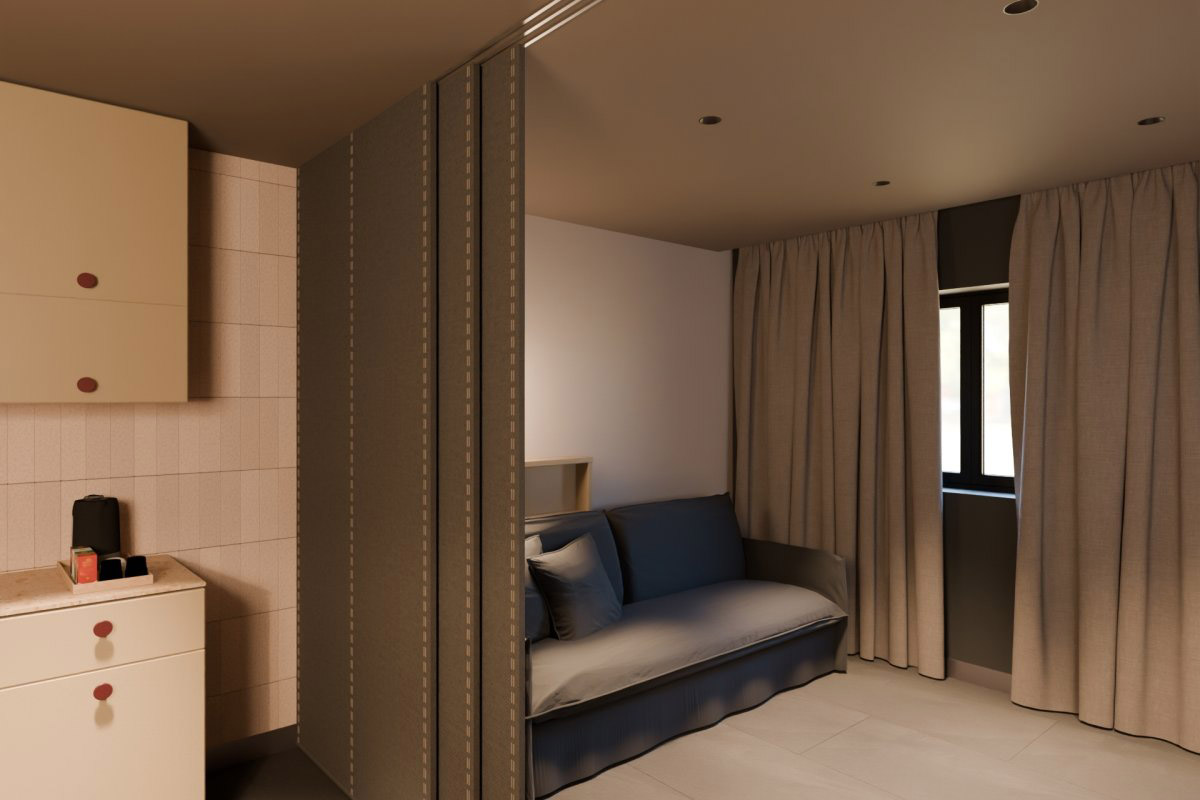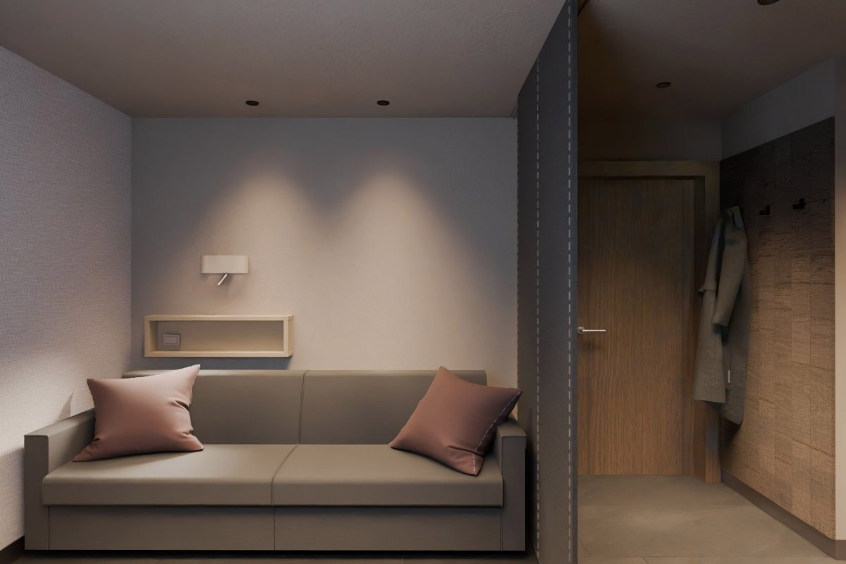 1 spálňa s manželskou posteľou oddelená od obývacej časti posuvnou stenou, obývacia izba s kuchynským kútom a rozkladacou pohovkou pre 1 alebo 2 osoby, sociálne zariadenie so sprchou