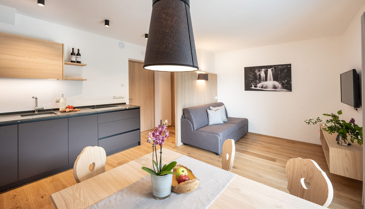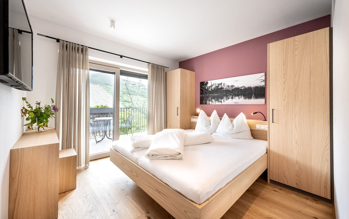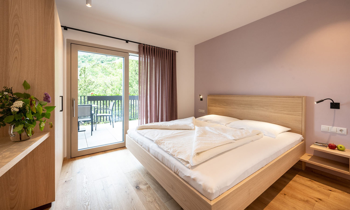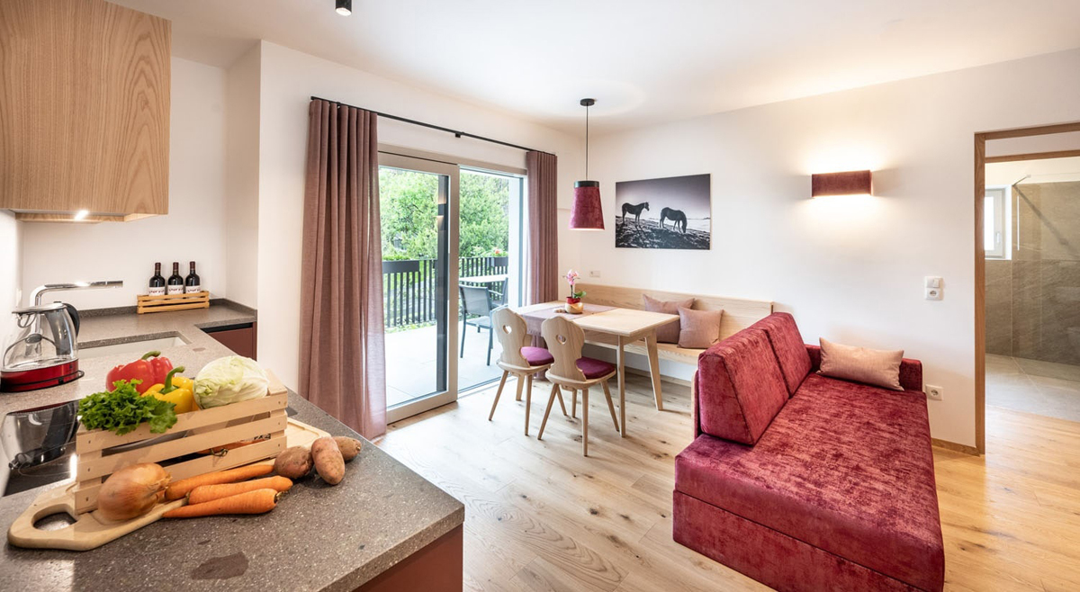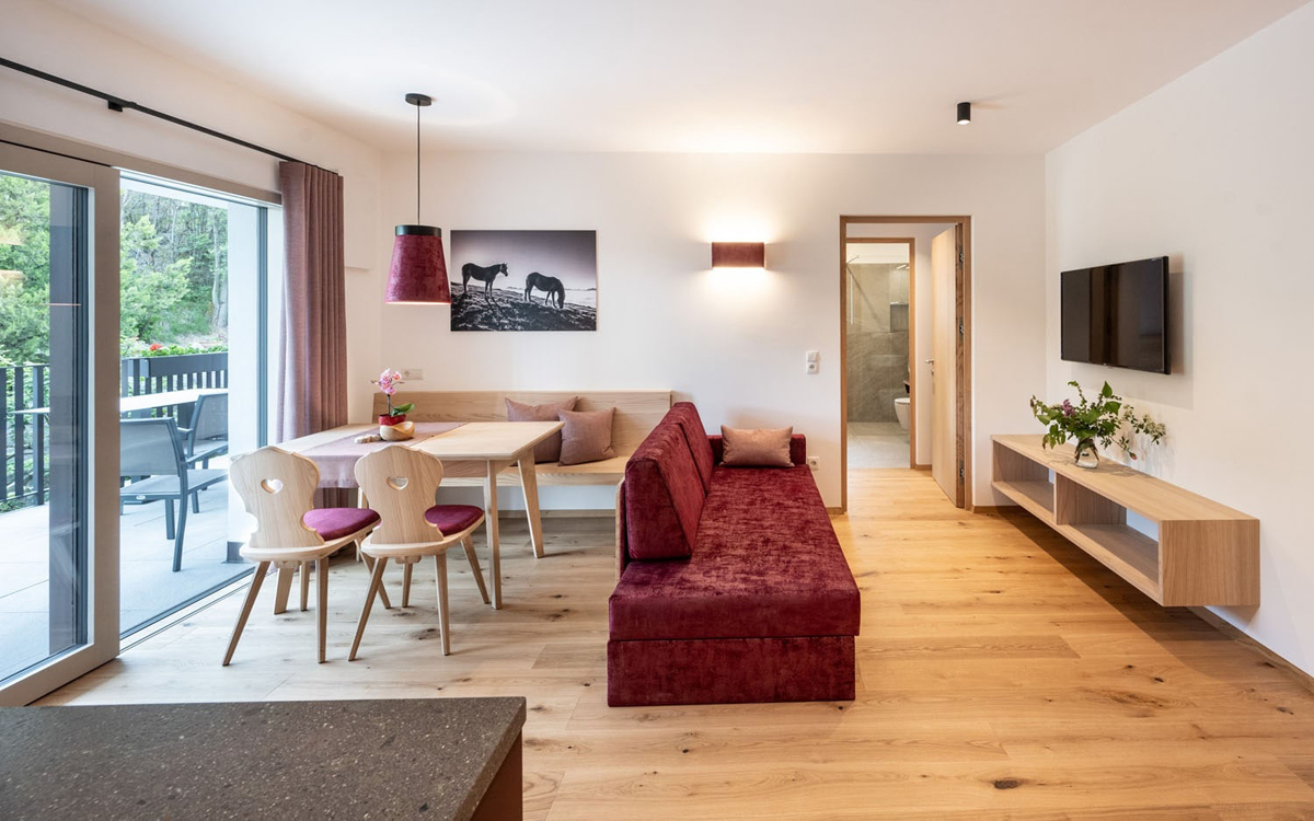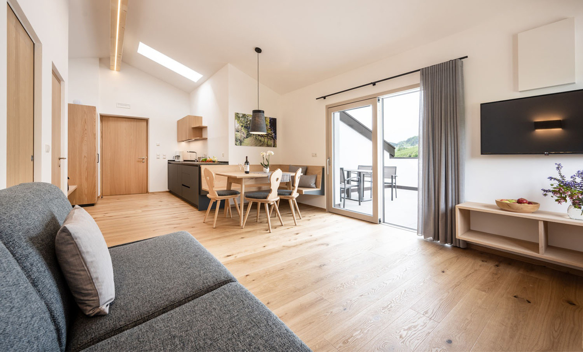 trilo 4 Vernatsch - 57 m² - 2x spálňa s manželskou posteľou a vlastným sociálnym zariadením, obývacia izba s kuchynským kútom, 1x balkón, veľká terasa (17 m²)