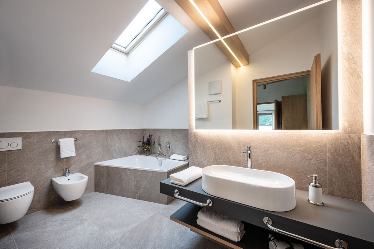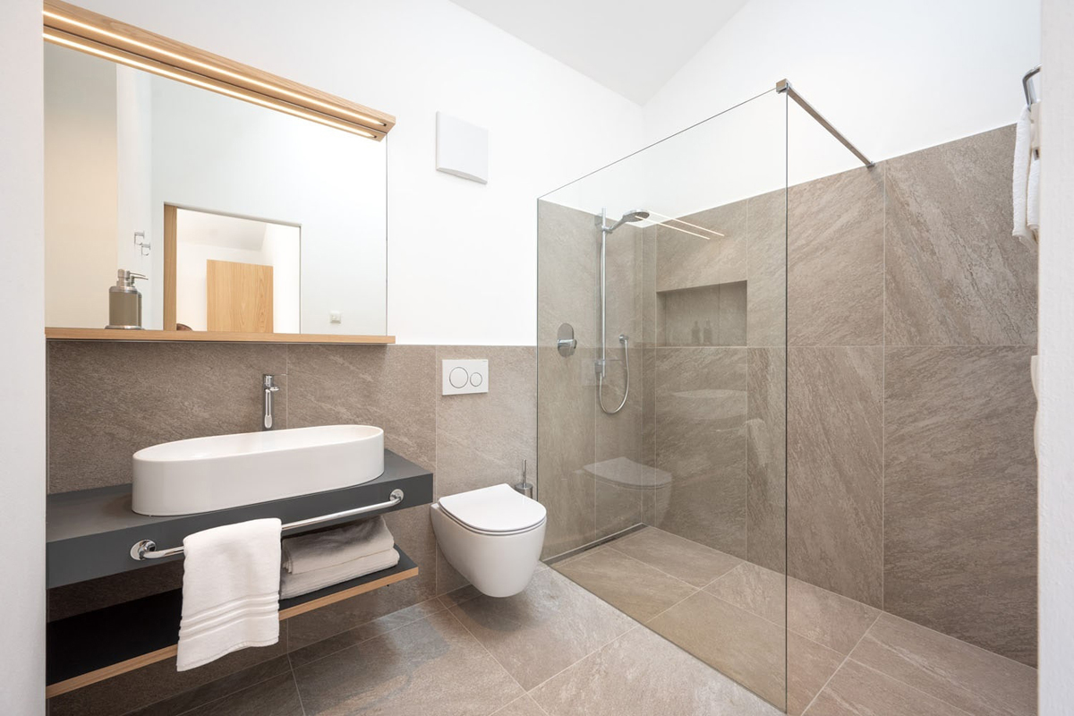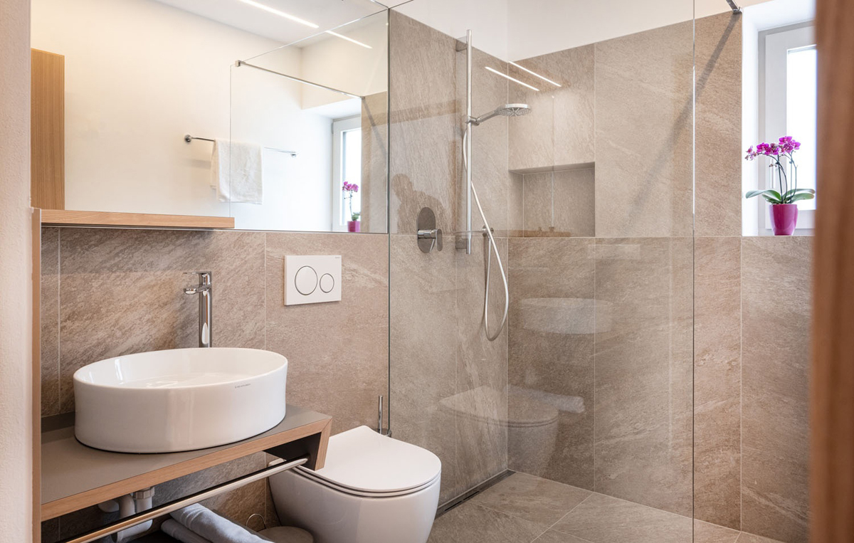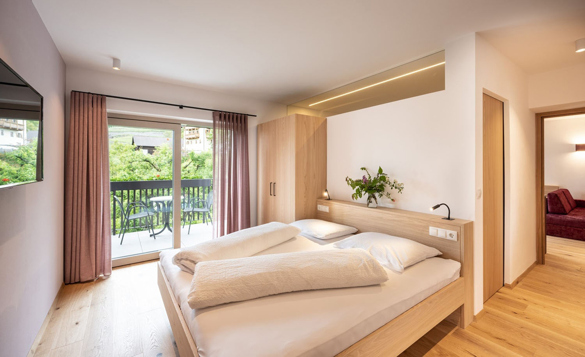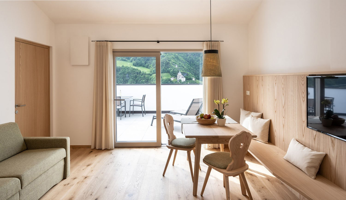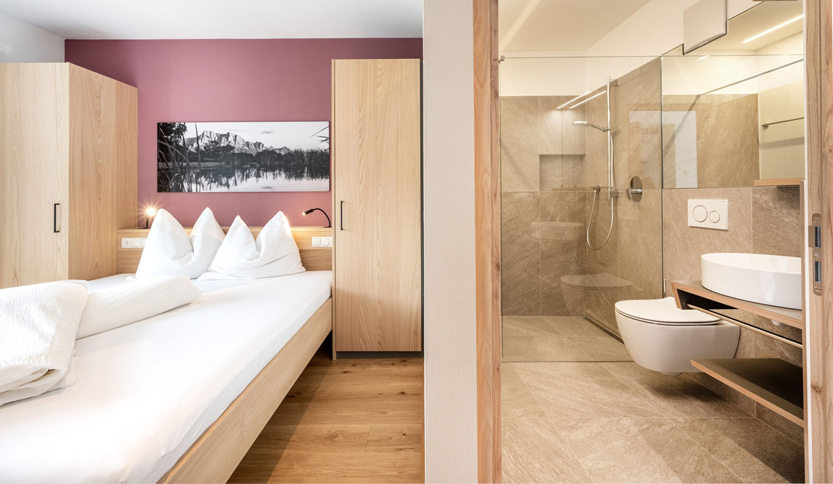 trilo 4 Vernatsch - 57 m² - 2x spálňa s manželskou posteľou a vlastným sociálnym zariadením, obývacia izba s kuchynským kútom, 1x balkón, veľká terasa (17 m²)