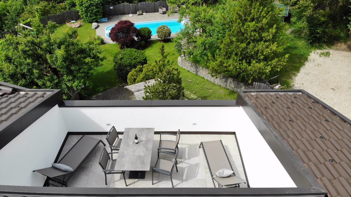 trilo 6 Blauburguder - 65m² - 2x spálňa s manželskou posteľou a vlastným sociálnym zariadením, obývacia izba s kuchynským kútom a rozkladacím gaučom pre 2 osoby, balkón, veľká terasa (20 m²)