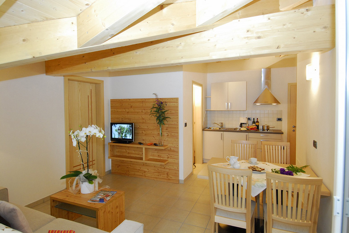 bilo 4 Lärche - 40 až 45 m² - spálňa s manželskou posteľou a samostatným lôžkom, obývacia izba s rozkladacím gaučom a kuchynským kútom, sociálne zariadenie s vaňou, balkón